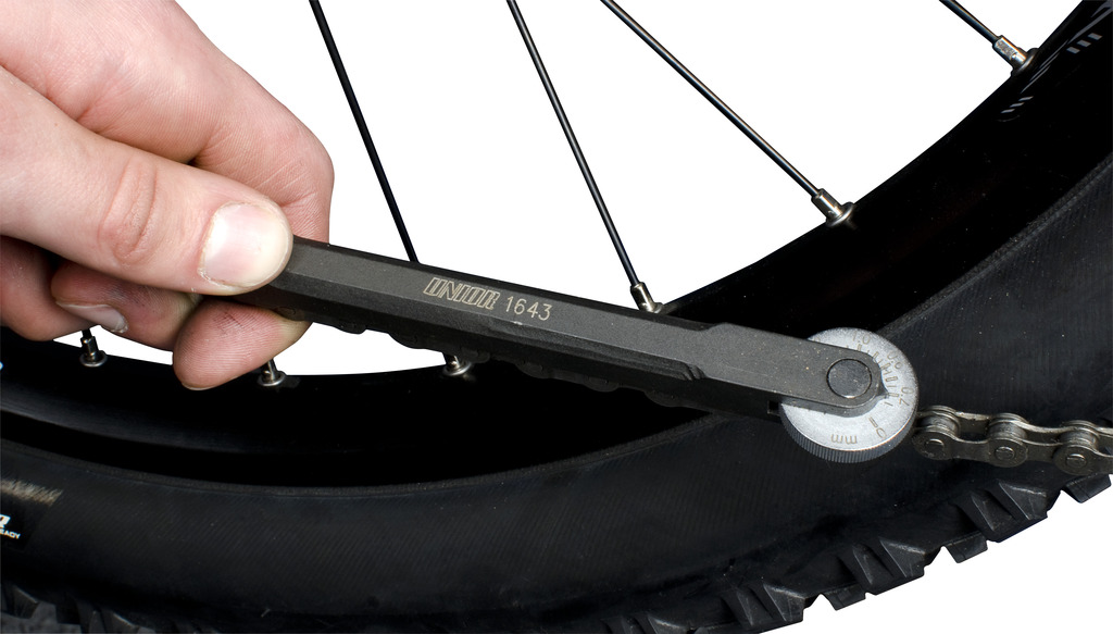 Medidor de desgaste de corrente profissional Unior Como usar a ferramenta: Para melhorar a passagem de mudanças e eliminar o desgaste irregular da transmissão, a maioria dos fabricantes recomenda a substituição da corrente antes ou depois de 0,6% de alongamento. Agora, podes determinar com rapidez e precisão o desgaste e a elasticidade de qualquer corrente. Simplesmente insere os pinos do verificador de corrente em dois elos, pressiona o medidor do braço oscilante com força e, em seguida, verifica a janela do medidor para uma leitura precisa.