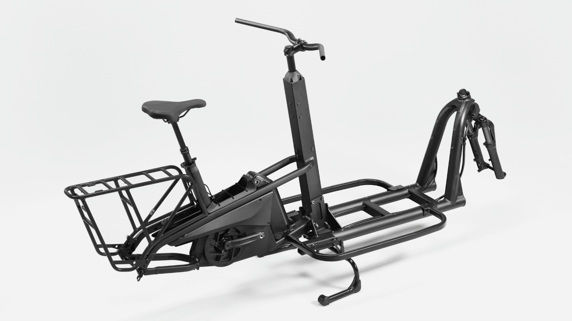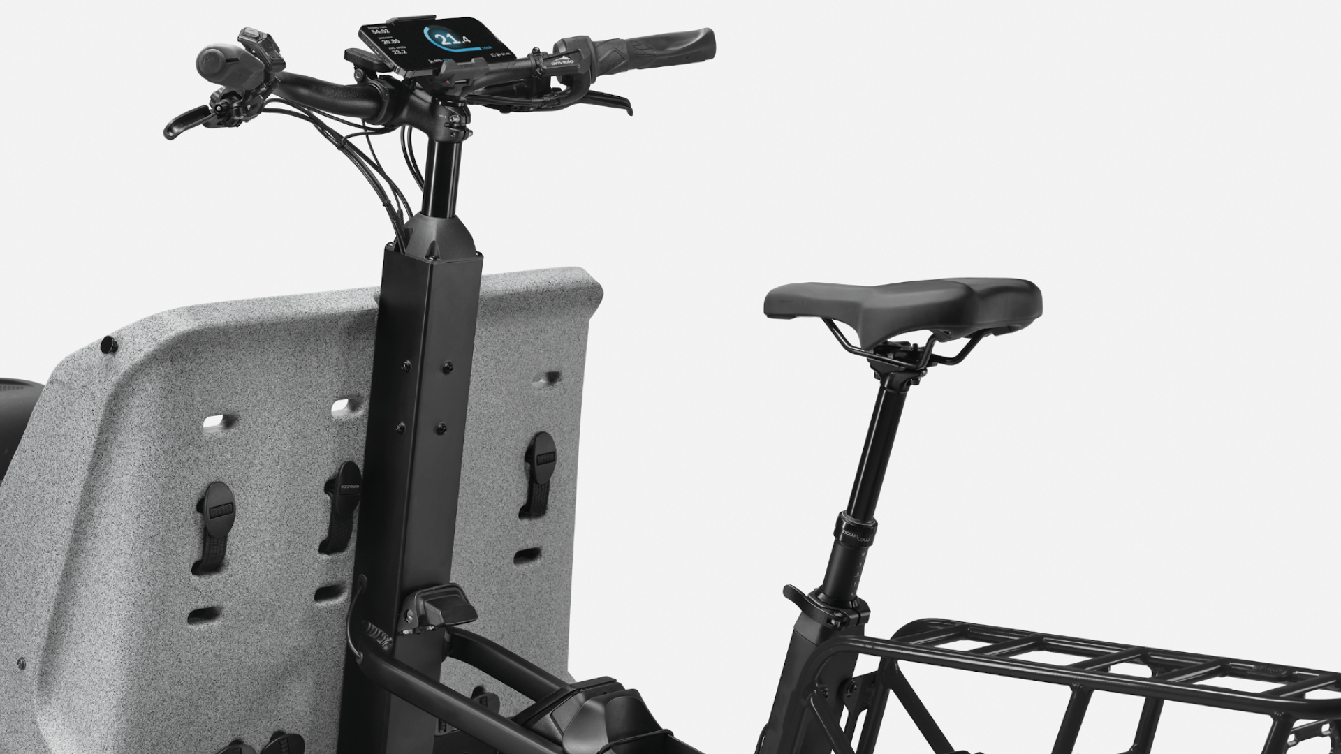 Estrutura de carga em alumínio SmartForm C2, low step, direção por cabo, cabina dupla para crianças à prova de intempéries, encaminhamento de cabos semi-integrado, compatível com bateria dupla externa, suporte integrado, compartimento de utilidades integrado, porta-bagagens traseiro compatível com assento de criança com Racktime SnapIt 2.0 e suporte para engate de reboque, luzes dianteiras LED duplas, suporte triplo para gaiola de garrafa. Caixa de direção rolamentos industriais cónicos e vedados duplos Acros, passagem de cabos interna