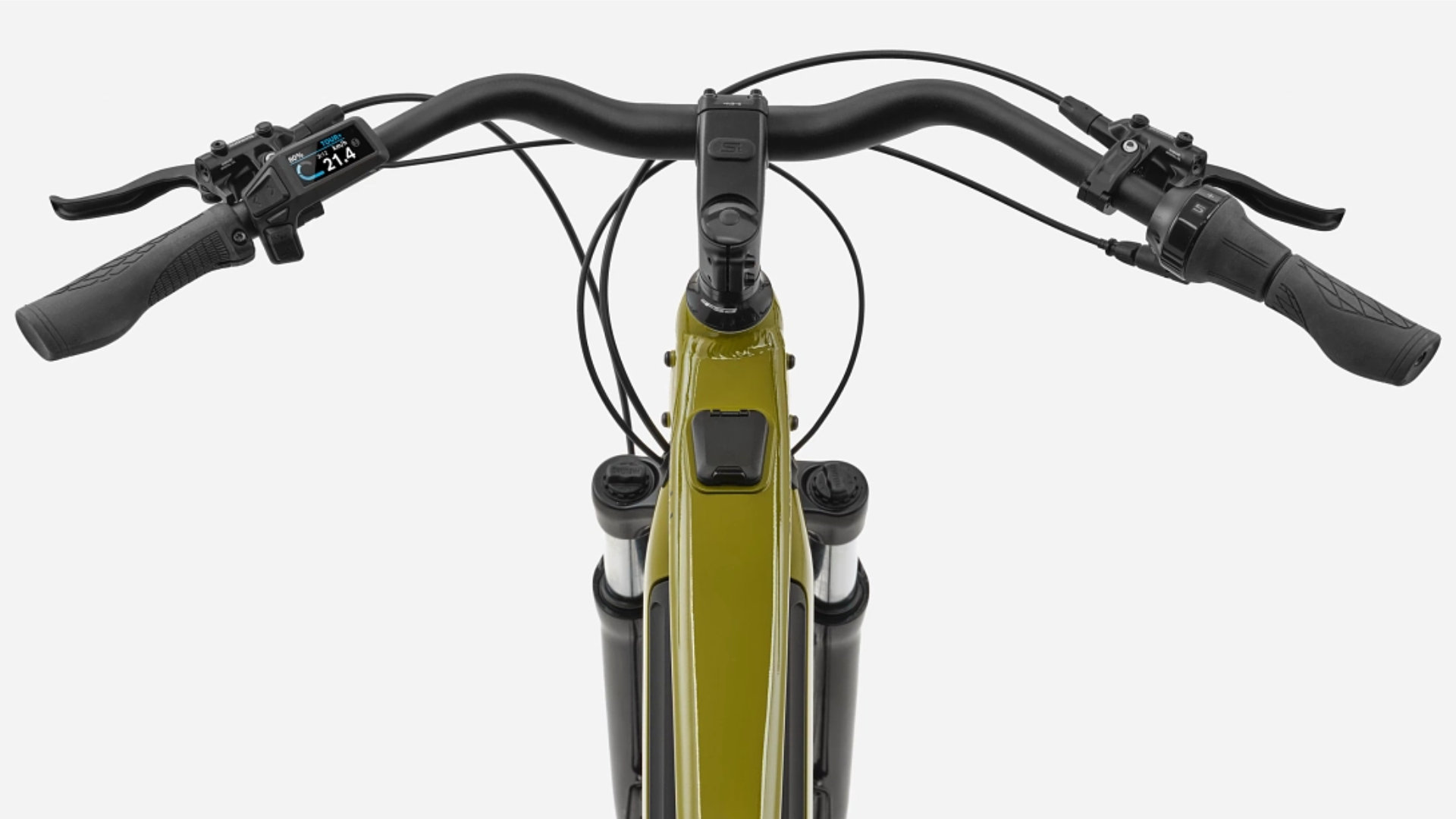 SmartForm C2 em alumínio, bateria amovível de 625Wh no tubo inferior, refletor integrado no tubo da cabeça, tubo da cabeça cónico, encaminhamento interno dos cabos, espaçamento do cubo QR de 135 mm, suporte de disco IS, proteção do motor. Caixa de direção semi-integrada, cónica; 1-1/8"-1-1/2”