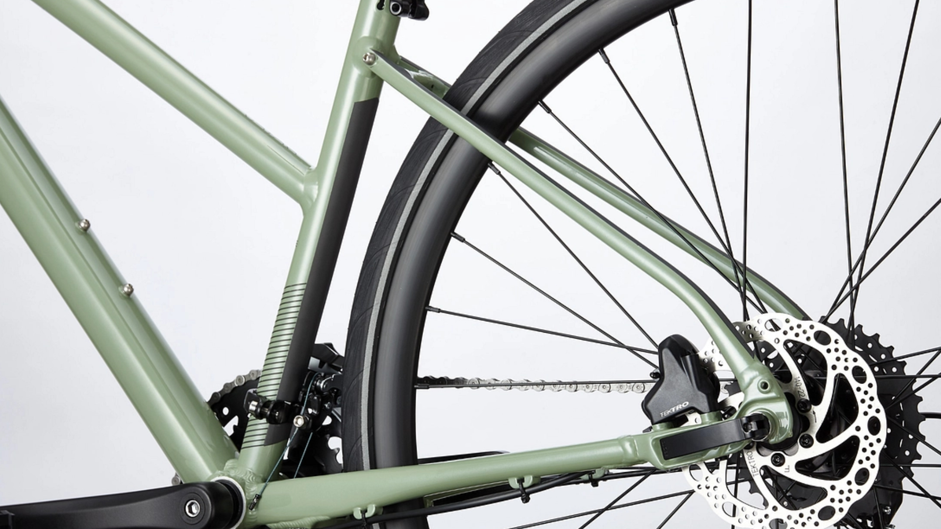 Totalmente em carbono, eixo passante 12x100 mm, direção cónica de 1-1/4“ a 1-1/8”, disco de montagem plana, suportes para guarda-lamas, refletividade de 360º