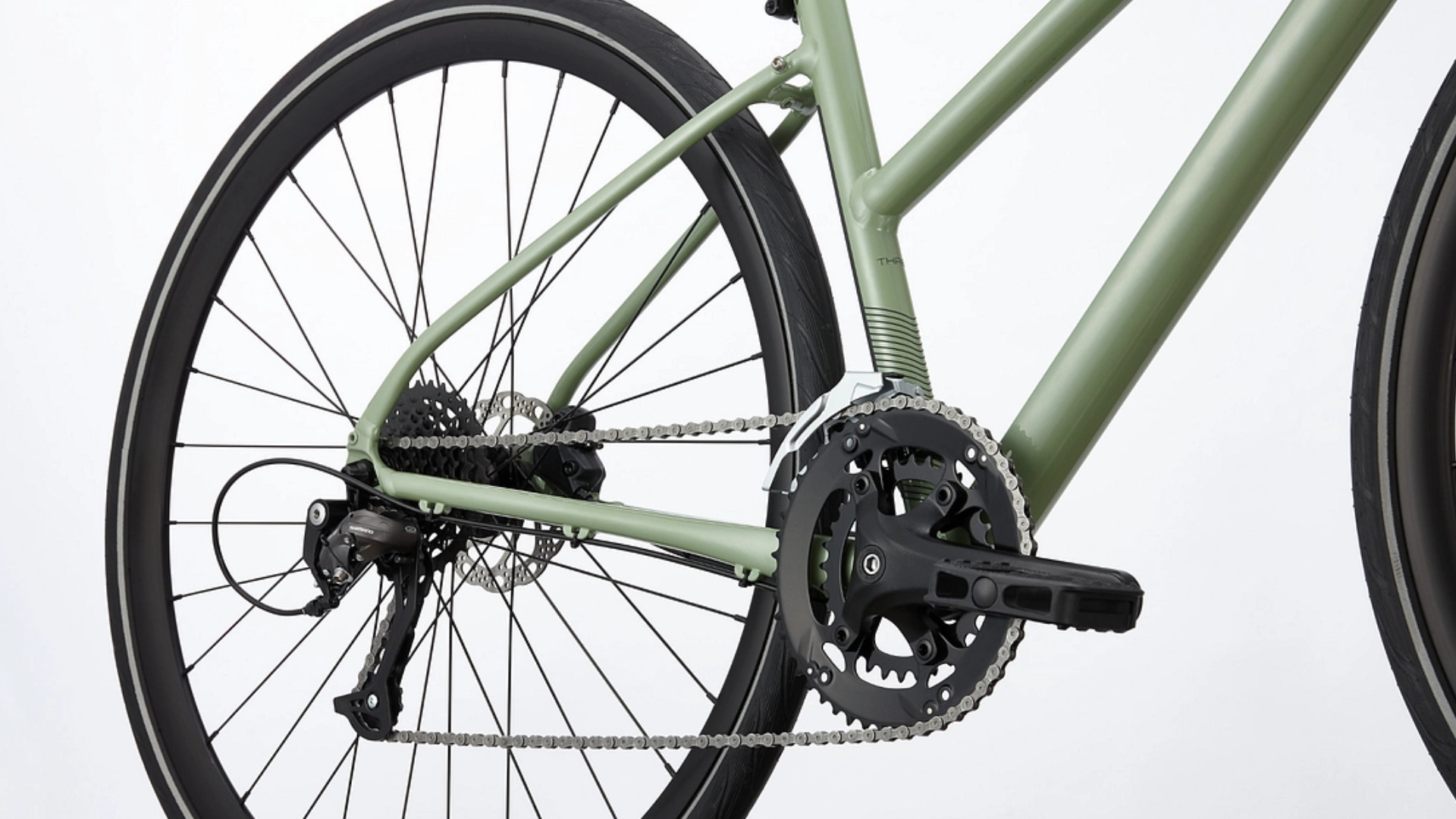 Desviador traseiro Shimano Alivio, Shadow GS. Desviador dianteiro Shimano Acera, braçadeira 31.8mm. Manípulos Shimano Altus, 9 velocidades. Pedaleira Prowheel, 48/32D. Corrente KMC Z9, 9 velocidades. Cassete Sunrace, 11-34, 9 velocidades. Movimento pedaleiro cartucho Tangue, cónico quadrado. Pedais Cannondale Fitness Reinforced Composite