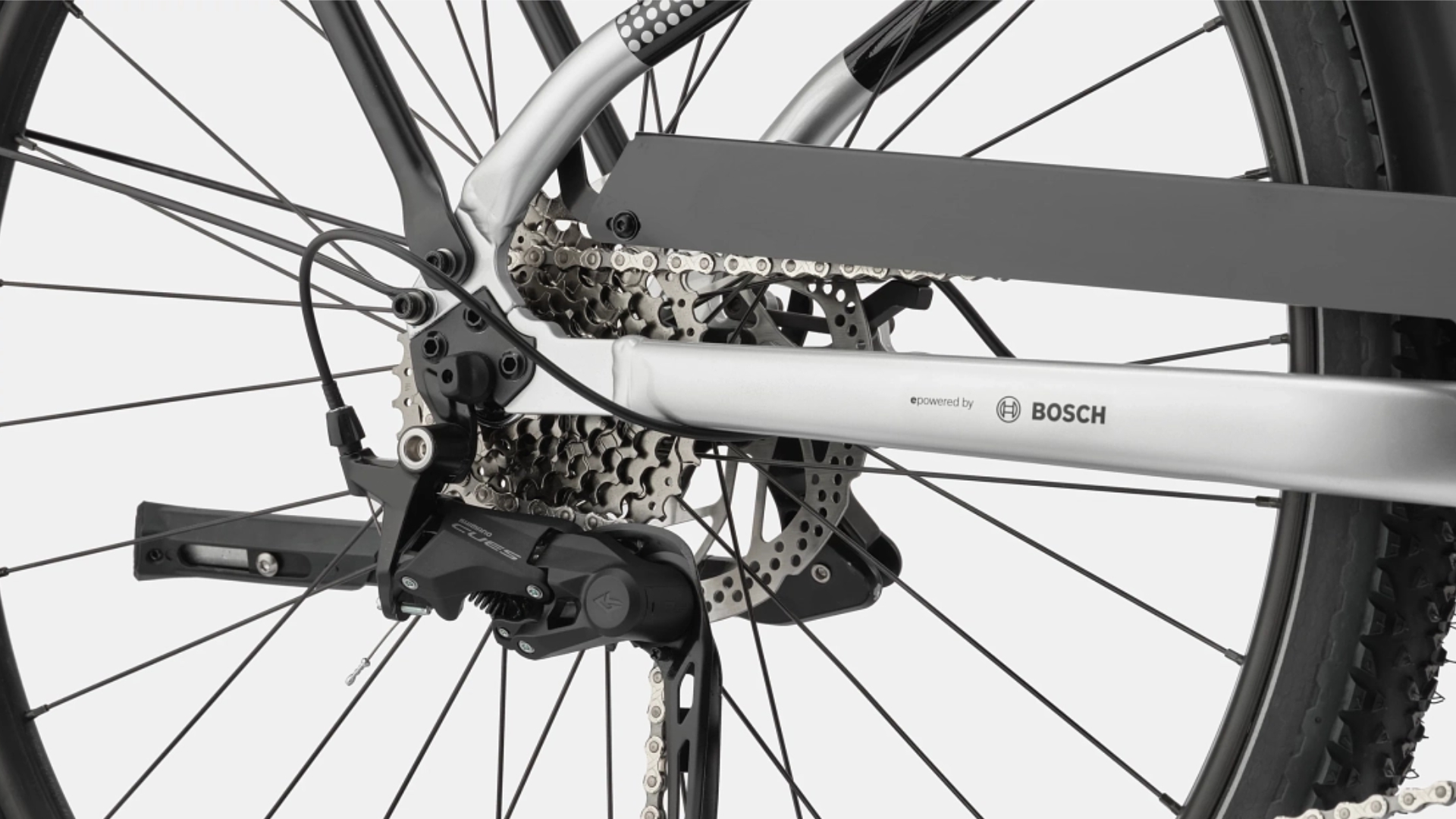Desviador Traseiro Shimano CUES 4020, 9 velocidades/ Manípulos Shimano CUES 4000, 9 velocidades/ Corrente KMC E500/ Pedaleira FSA for Bosch/ Cassete Shimano CUES 400 11-36, 9 velocidades