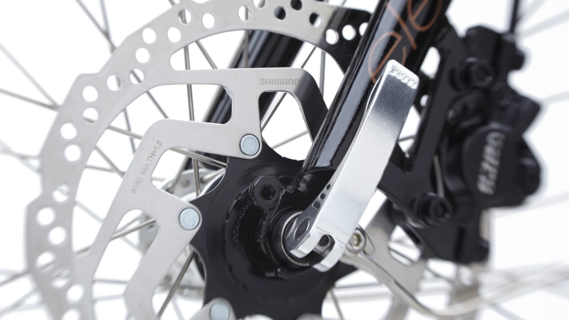 Cubo (F) Flange inferior em alumínio com disco Centerlock, 36 f (T) Shimano Nexus 5-speed internal w/center lock disc brake 36h. Aperto rápido de 100x5mm. Raios 14g aço inoxidável. Pneus largos Schwalbe Fat Frank de 26” × 2,35”, antifuro, carcaça Kevlar