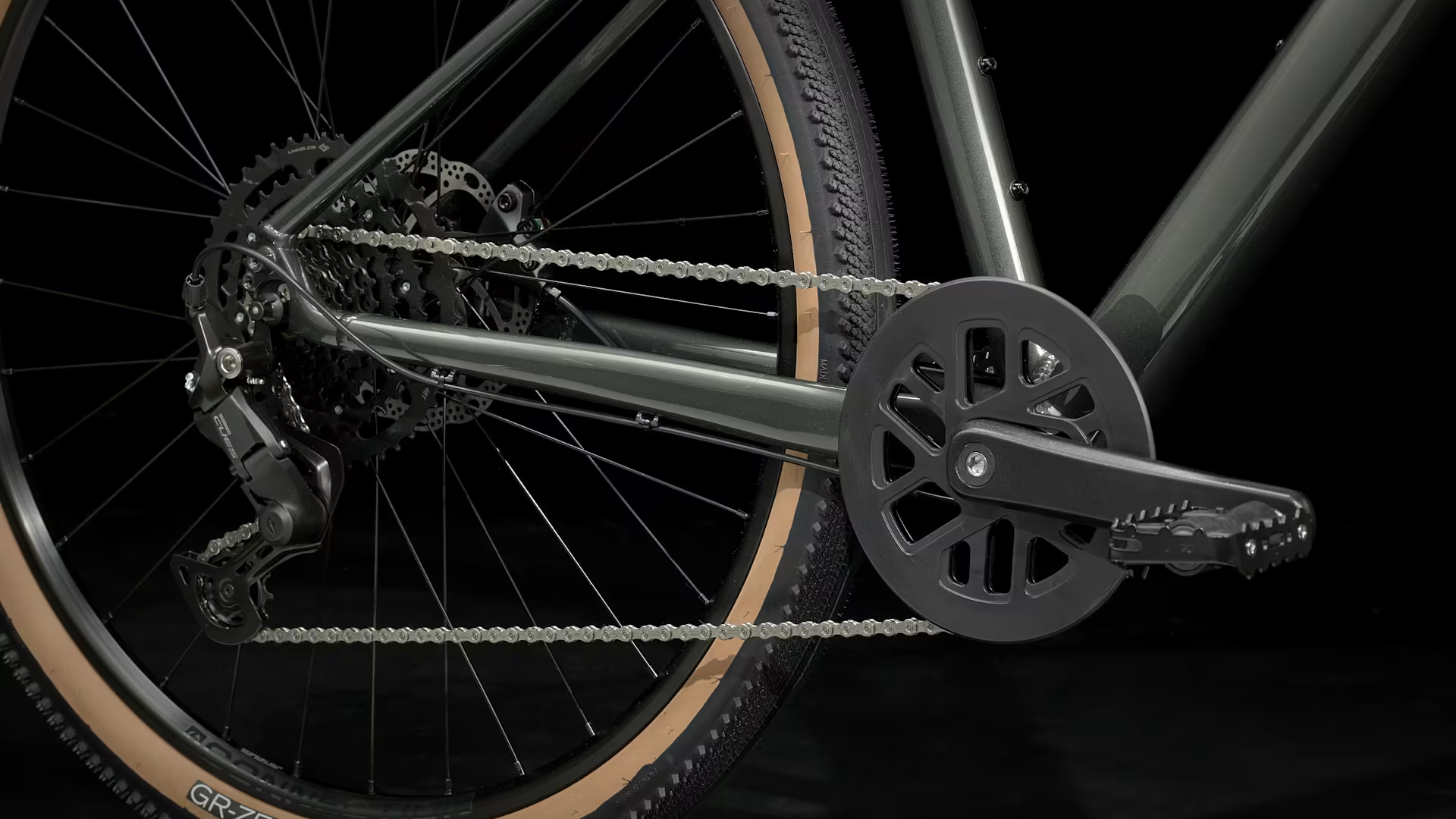 Manípulos Shimano U4000, 9 velocidades. Desviador traseiro Shimano CUES U4000. Pedaleira Prowheel alumínio, prato estreito-grande 40D, comprimento de 170 mm. Cassete Shimano LINKGLIDE LG300, 11-46, 9 velocidades. Corrente Shimano LG500. Movimento pedaleiro, cartucho selado, 68mm. Pedais Wellgo com corpo de nylon, caixa em alumínio.