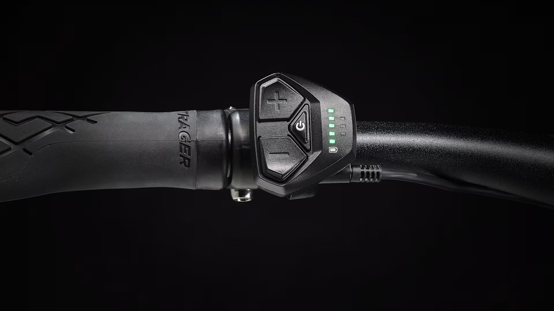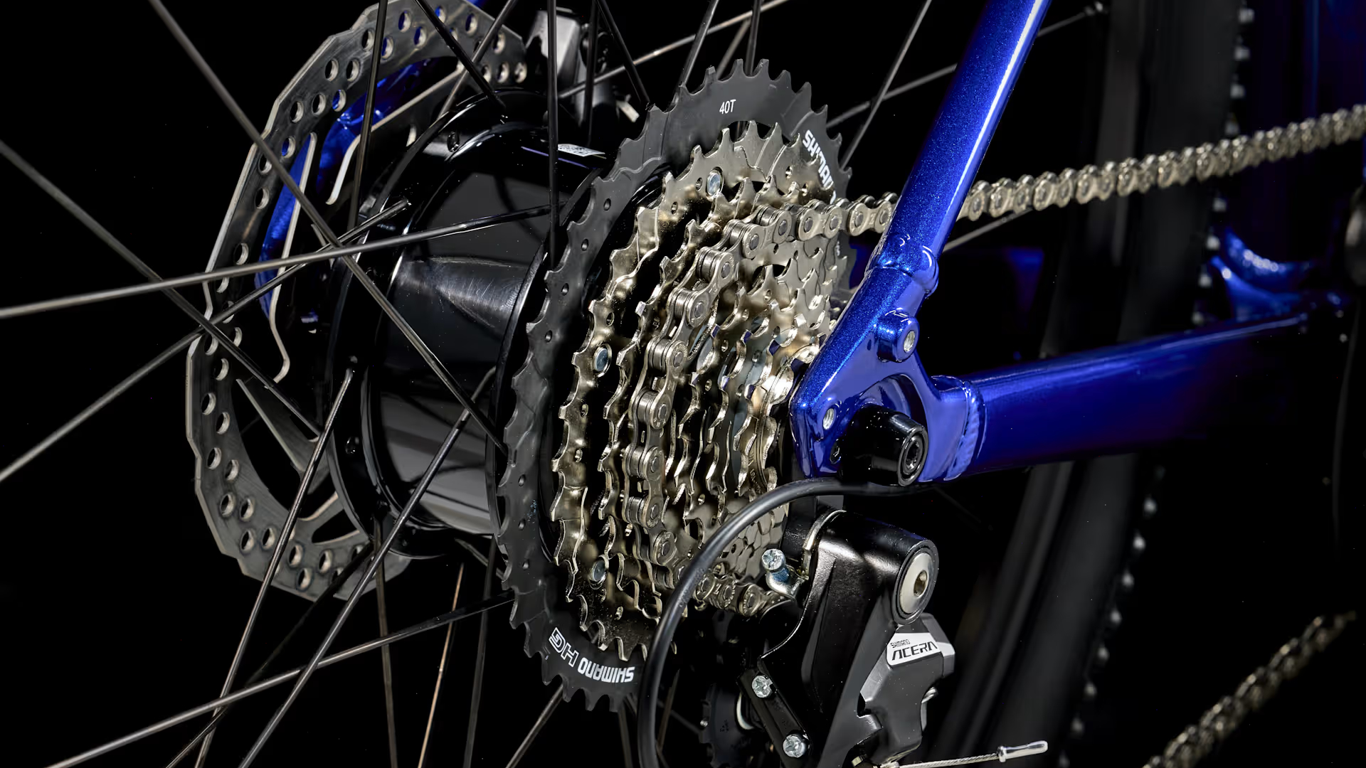Manípulo Shimano M315, 8 velocidades. Desviador traseiro Shimano Acera M3020-8, carreto máximo de 40 D. ProWheel Pro em alumínio, prato estreito-grande 42D, comprimento de 175 mm. Movimento pedaleiro, sensor de binário, com rosca, veio de 122,5 mm. Cassete Shimano HG400, 11-40, 8 velocidades. Corrente KMC Z8.3. Pedais Bontrager City.