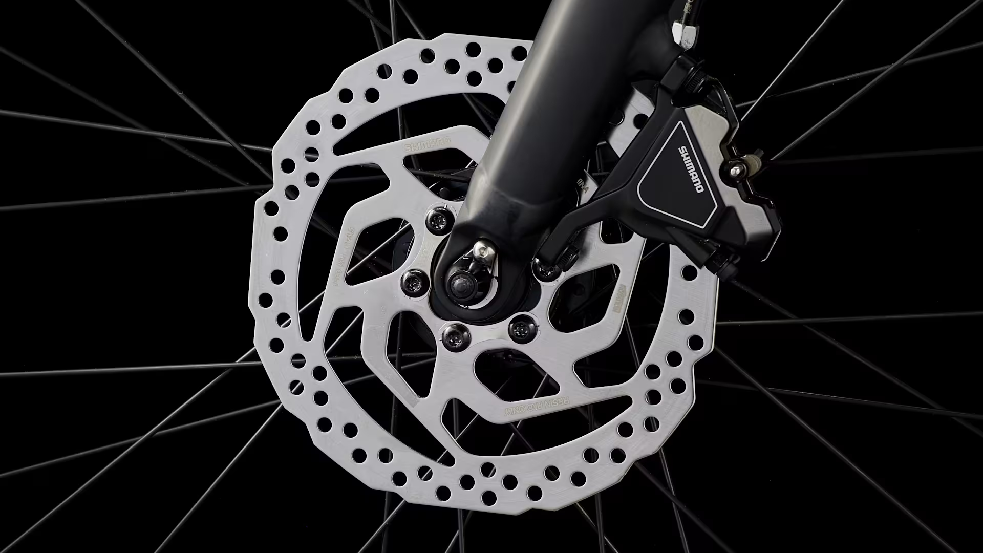 Shimano, disco hidráulicos, Shimano, manete MT200, pinça UR300. Rotores Shimano RT26, 6 parafusos, 160 mm.