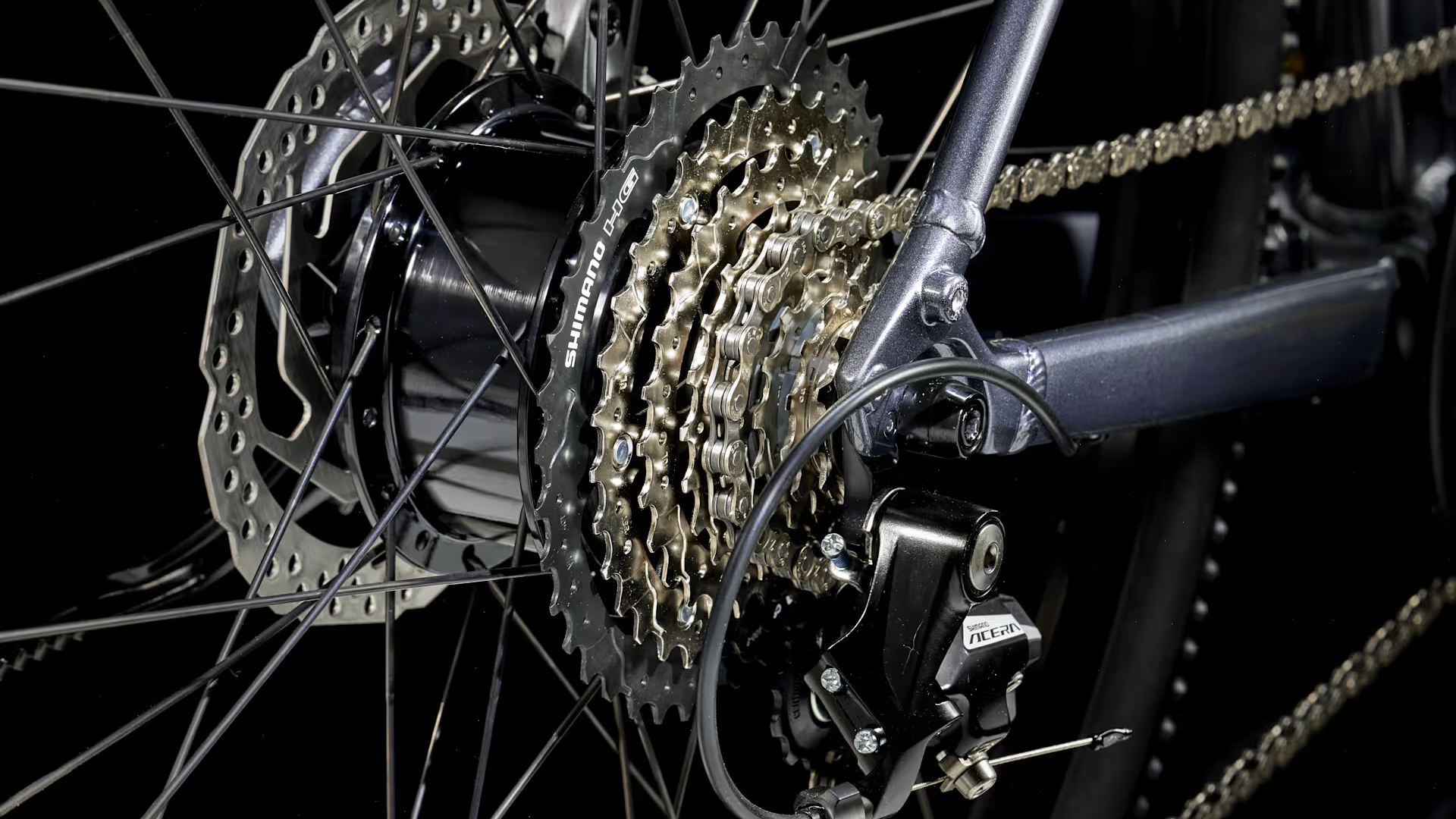 Manípulo Shimano M315, 8 velocidades. Desviador traseiro Shimano Acera M3020-8, carreto máximo de 40 D. ProWheel Pro em alumínio, prato estreito-grande 42D, comprimento de 175 mm. Movimento pedaleiro, sensor de binário, com rosca, veio de 122,5 mm. Cassete Shimano HG400, 11-40, 8 velocidades. Corrente KMC Z8.3. Pedais Bontrager City.