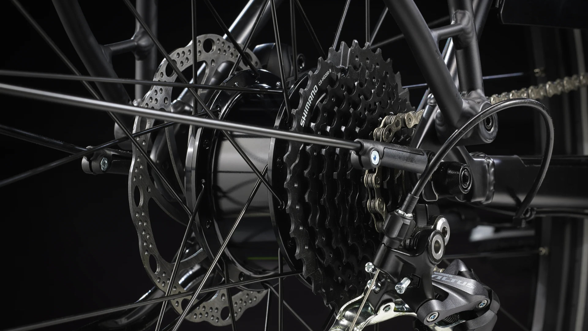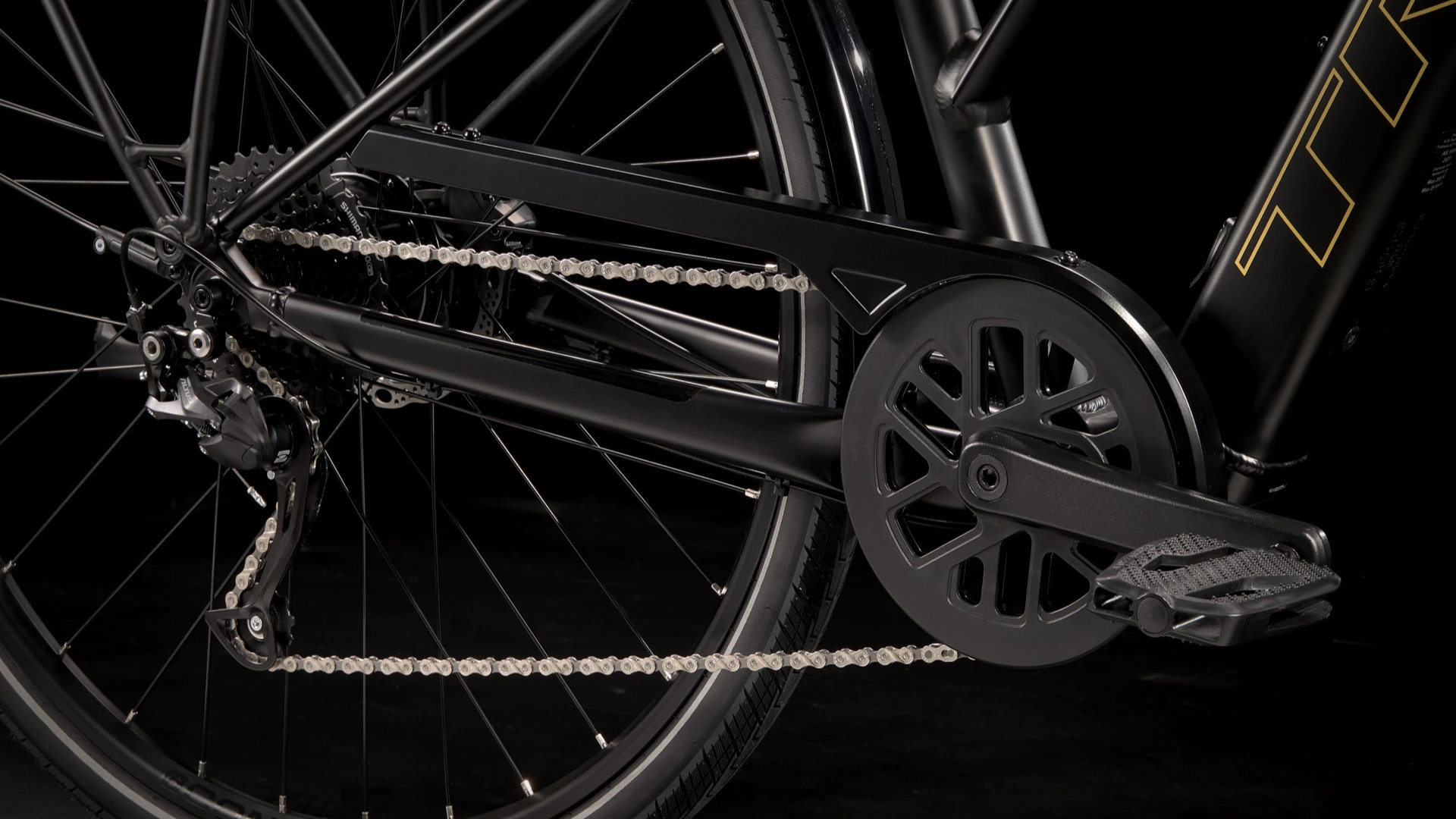 Um quadro leve em alumínio com um design stagger que facilita o montar e desmontar, sistema de pedalada assistida patenteado pela Trek com motor de cubo (250 Wh, 40 Nm) que assiste até aos 25 km/h e uma bateria de 250 Wh para uma autonomia de até 56 km por carregamento. Além disso, tem rodas de 700c rápidas, pneus 40c de rolamento rápido estáveis com paredes laterais refletoras, uma fiável transmissão Shimano de 9 velocidades, travões de disco hidráulicos, luzes integradas alimentadas pela bateria, um porta-bagagens traseiro compatível com MIK, guarda-lamas e um descanso.