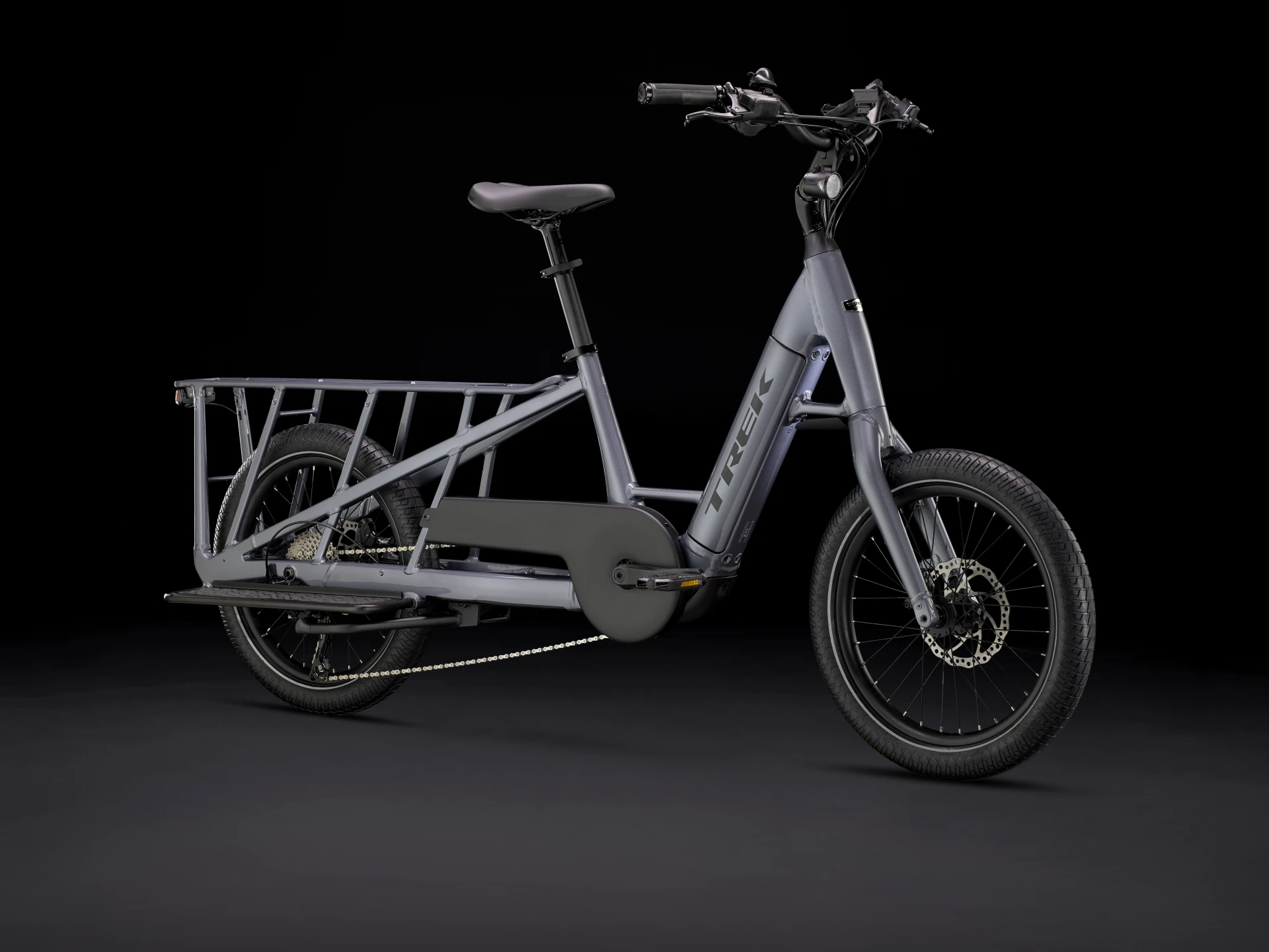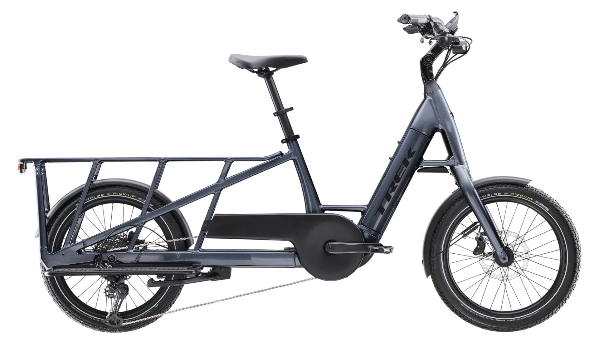 Um quadro em alumínio resistente de tamanho único, uma bateria Bosch PowerTube de 500 Wh e um sistema de transmissão Performance Line CX potente com sistema inteligente da Bosch (250 Wh, 85 Nm) que te ajuda a manter velocidade até aos 25 km/h e um ecrã SmartPhone Grip que oferece muitas funcionalidades de conetividade. Uma transmissão Shimano Deore de 10 velocidades com uma cassete de ampla relação, travões hidráulicos de 4 pistões que conferem potência de travagem de confiança, espigão telescópico regulável para montar e desmontar com facilidade, punhos ergonómicos e um descanso Trek Fetch estável. Kit de família, kits de alforges e adaptadores para cadeira para criança vendidos em separado.