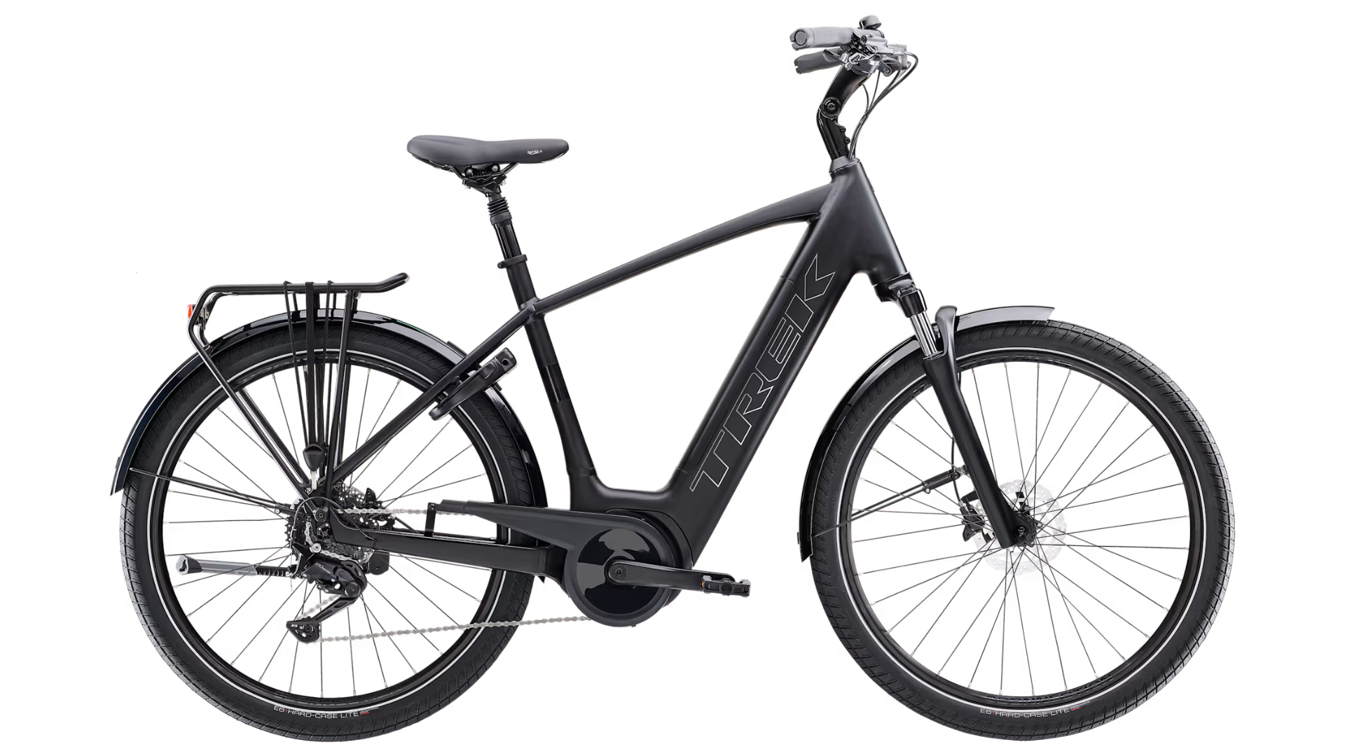 Selim Selle Royal Nuvola. Espigão Alumínio, suspensão, 31.6 mm, 300 mm de comprimento. Guiador Bontrager touring em alumínio. Punhos Herrmans Clik, ergonómico, encaixe. Avanço Bontrager em alumínio, abraçadeira de 31.8 mm, elevação ajustável, compatível com Blendr, comprimento de 105 mm