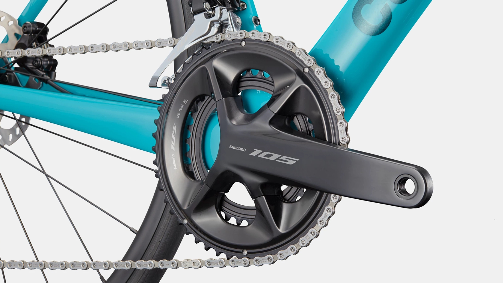 Desviador traseiro Shimano 105 Di2 R7150. Desiador dianteiro Shimano 105 Di2 R7170. Manípulos Shimano 105 Di2 R7170, wireless, 2x12-velocidades. Corrente Shimano 105, 12-velocidades. Pedaleira Shimano 105 R7100, 50/34. Cassete Shimano 105 R7100, 11-34, 12-velocidades. Movimento pedaleiro Shimano BB-RS500, BSA