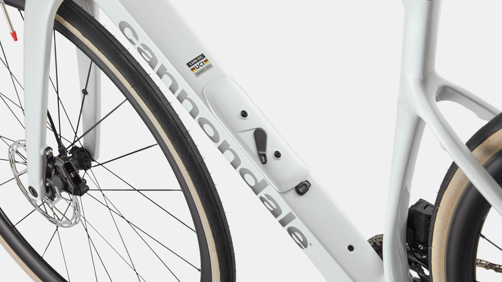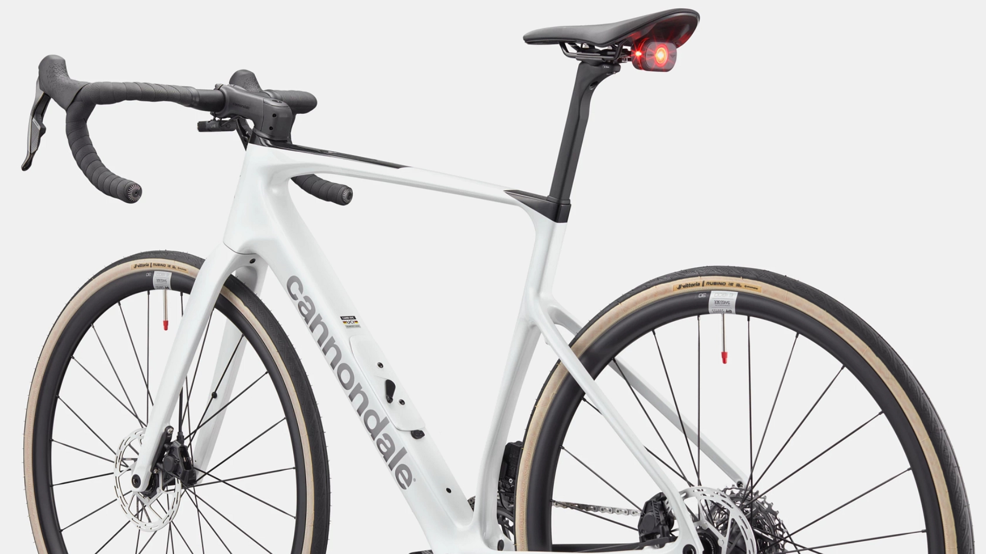 Sensor roda Cannondale. Sistema SmartSense Gen 2.0 (compatível com Bluetooth BLE e ANT+): Farol de saída variável SmartSense LightSkin U1E ultracompacto de 800 lúmenes, radar/farolim traseiro SmartSense Garmin Varia eRTL 615, bateria interna amovível SmartSense 43.2Wh com lanterna integrada, cabo de carregamento SmartSense SRAM AXS). Saco de armazenamento do tubo inferior StashBag grande. Válvulas tubeless Fillmore