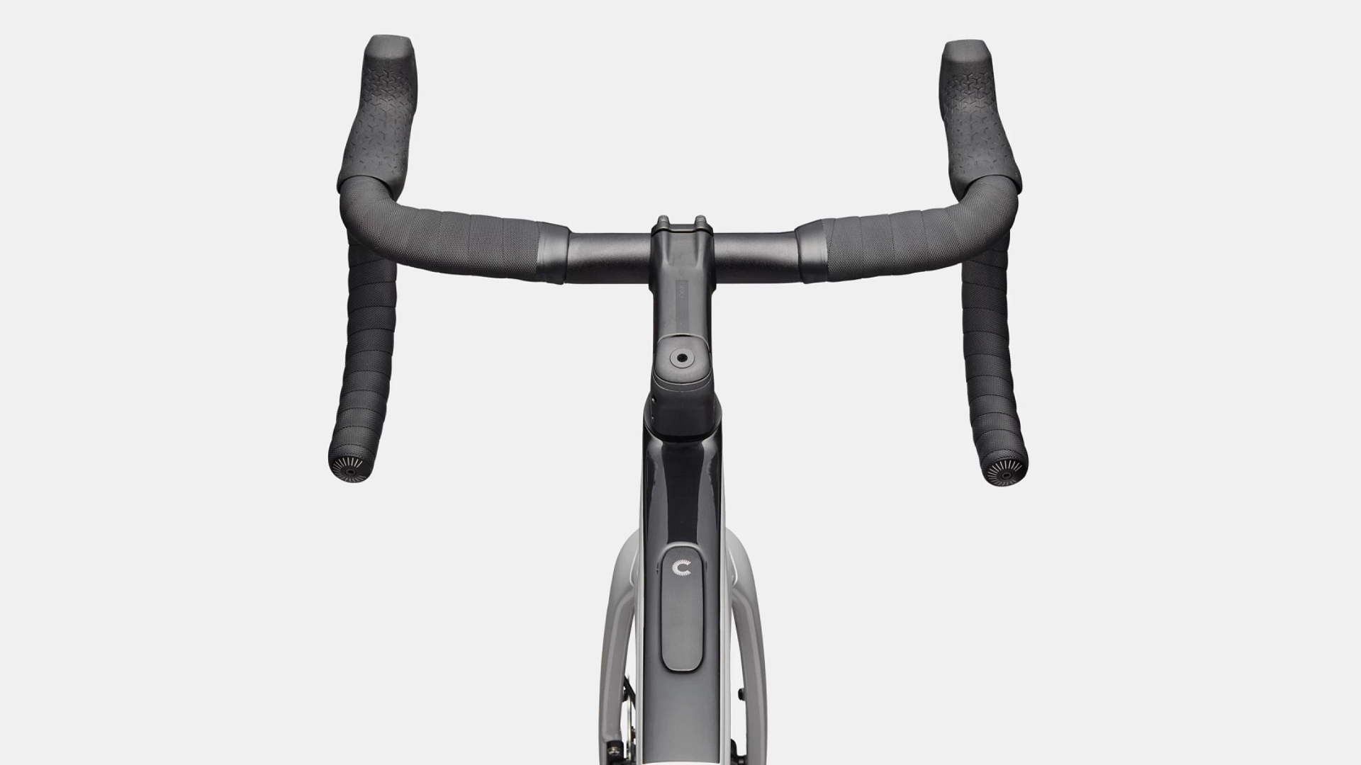 Guiador Vision Trimax Aero, alumínio. Avanço Cannondale C1 Conceal, alumínio, 31,8mm, -6°. Punhos Fizik Tempo Bondcush Soft, 3mm. Selim Fizik Vento Argo X5, 140mm. Espigão Cannondale C1 Aero 27, carbono, compatível com SmartSense, comprimento 330mm, 0mm offset (44-48cm), 15mm offset (51-61cm)