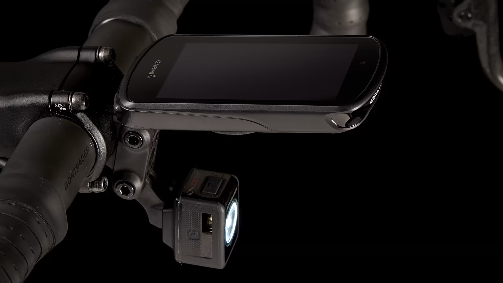 Guiador Bontrager Pro IsoCore VR-SF, 44 cm. Avanço Trek RCS Pro, -7 graus, comprimento de 110mm. Fita guiador Bontrager Supertack Perf. Selim Bontrager Verse Short Pro, carris em carbono, largura de 145 mm. Espigão de selim aerodinâmico em carbono KVF, offset de 20 mm, 320 mm de comprimento