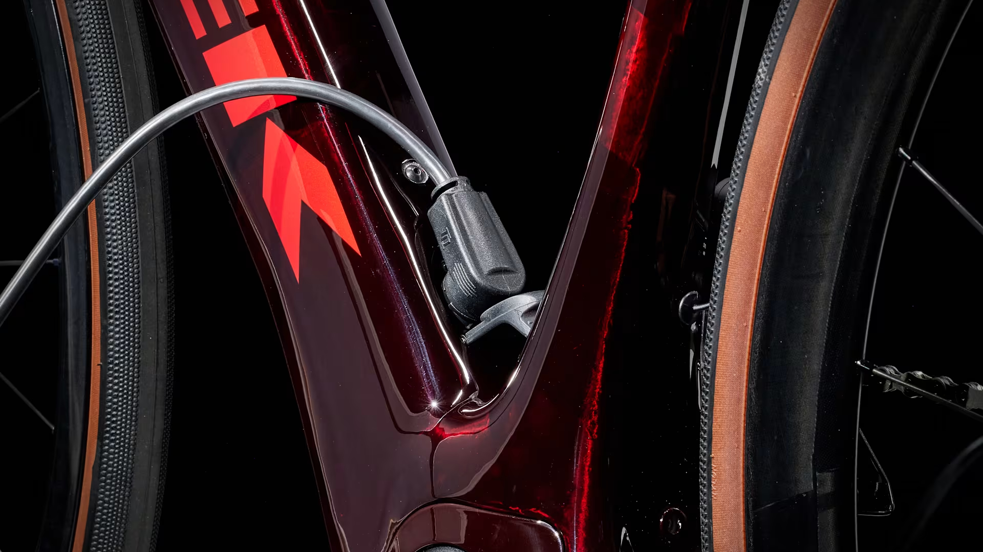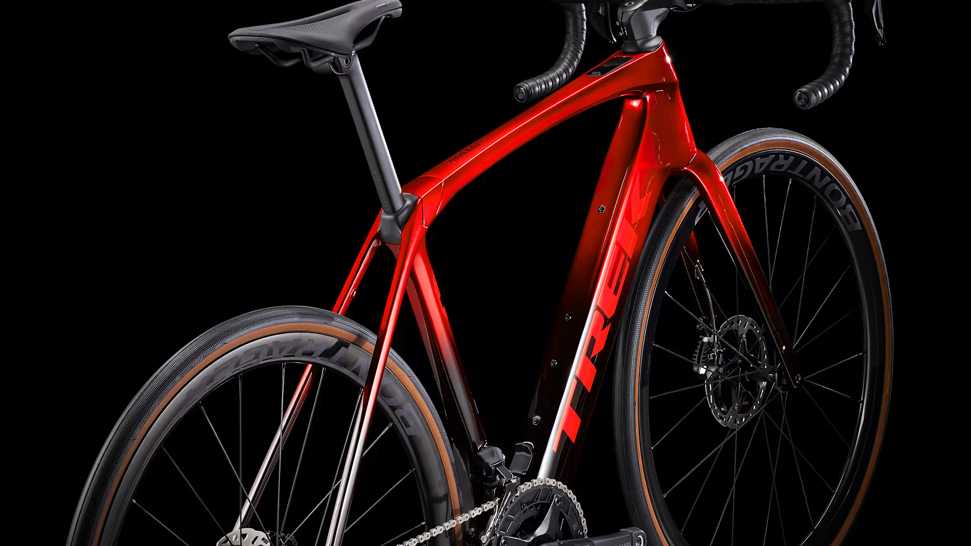 Domane+ em carbono, coluna de direção cónica em carbono, encaminhamento de cabos de travões, apoios de fixação para guarda-lamas, travões de disco flat mount, eixo passante de 12x100 mm