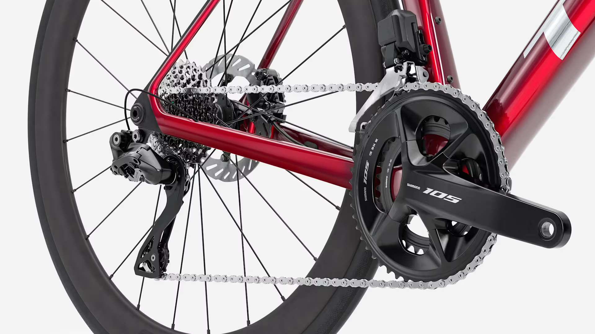 Carbono OCLV 500 Series, formato de tubos Full System Foil, tubo de espigão IsoFlow, sistema de caixa de direção RCS, passagem de cabos para sistema eletrónico ou mecânico, retentor de corrente aero removível, eixo pedaleiro T47, travões disco flat mount, ponteira de desviador universal, eixo passante