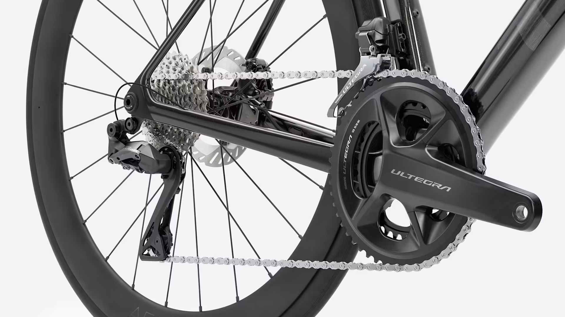 Manípulo de mudanças Shimano Ultega R8170 Di2, 12 velocidades. Desviador dianteiro Shimano Ultegra R8150 Di2, braze-on, cabo inferior. Desviador traseiro Shimano Ultegra R8150 Di2, carreto máximo 34 D. Pedaleira Shimano Ultegra R8100, 50/34, comprimento de 170 mm. Movimento pedaleiro Praxis, roscado T47, rolamento interno. Cassete Shimano Ultegra R8101, 11-34, 12 velocidades. Corrente Shimano XT M8100, 12 velocidades.