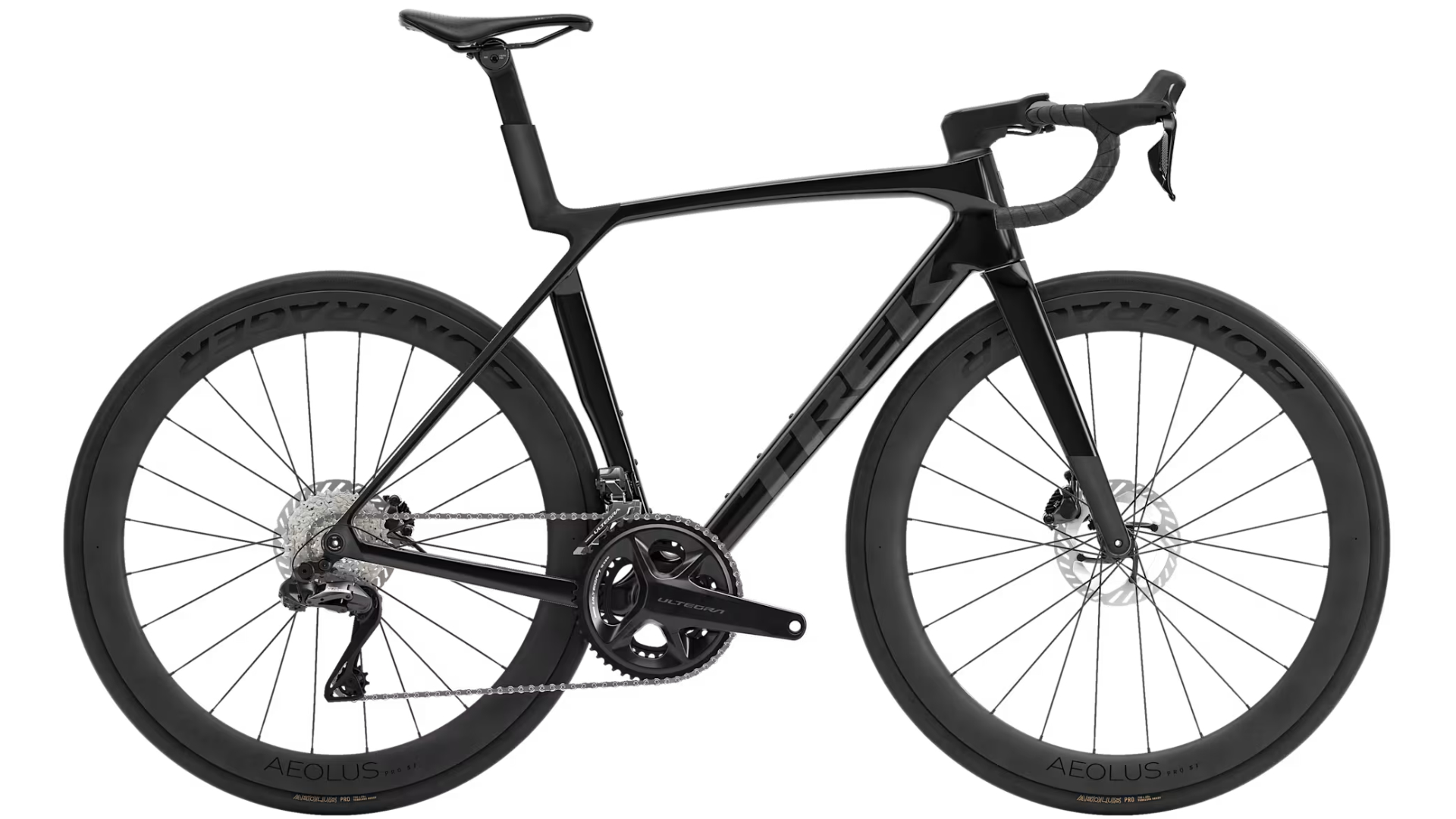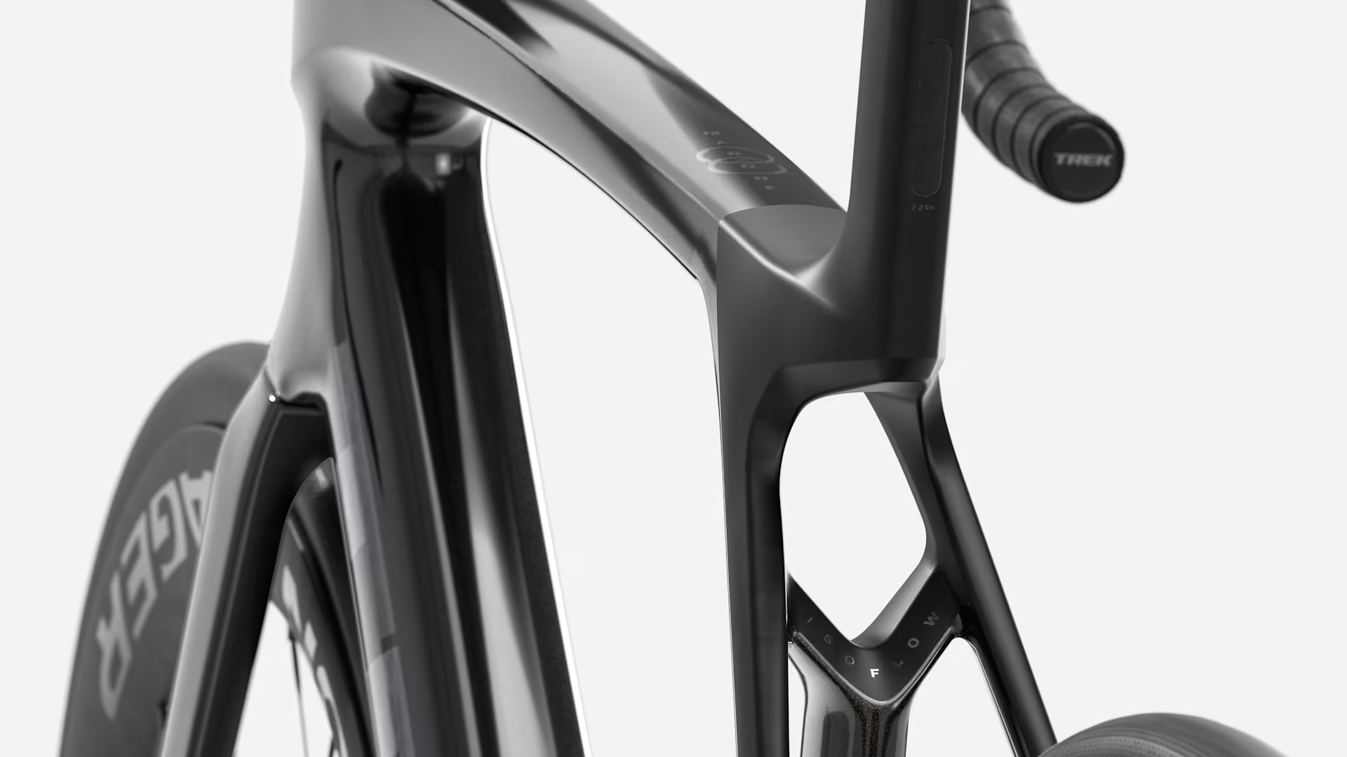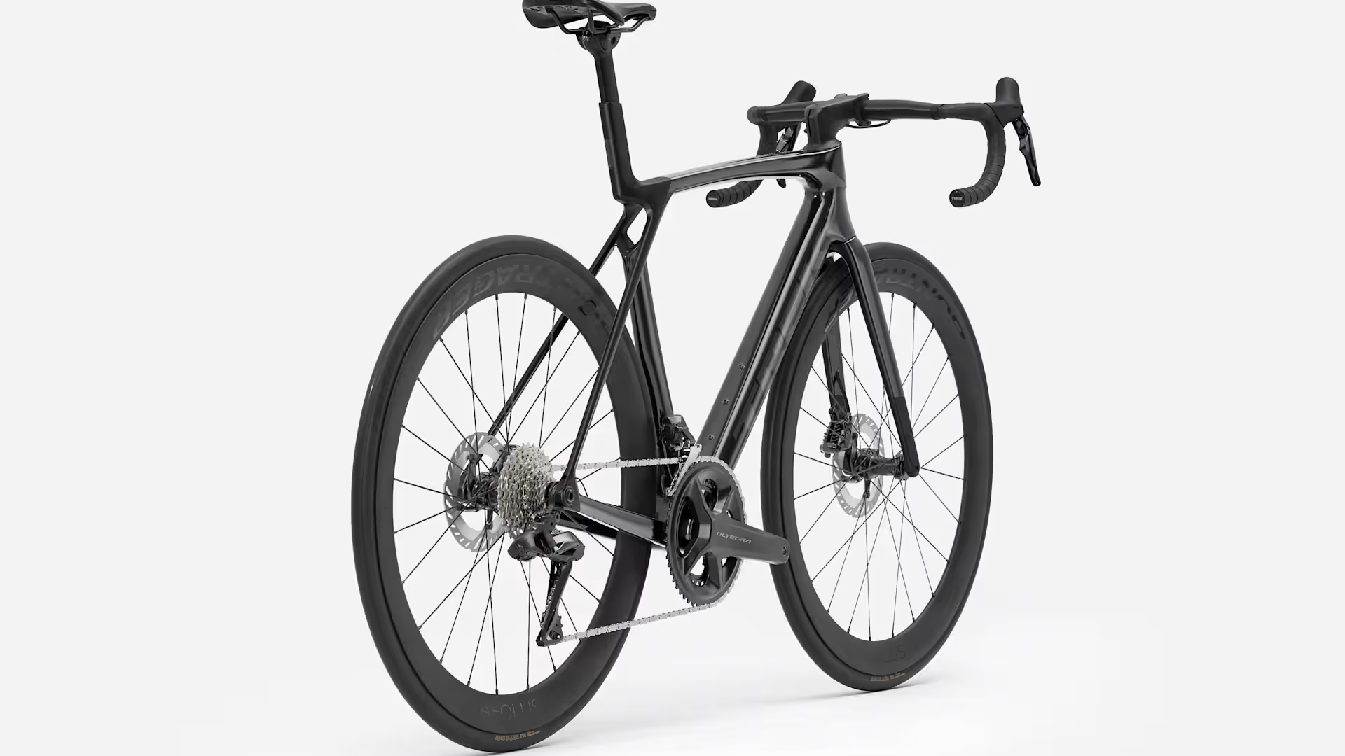 Madone Gen 8 totalmente em carbono, coluna de direção cónica em carbono, cabos internos dos travões, travões de disco flat mount, eixo passante biselado de 12x100 mm.