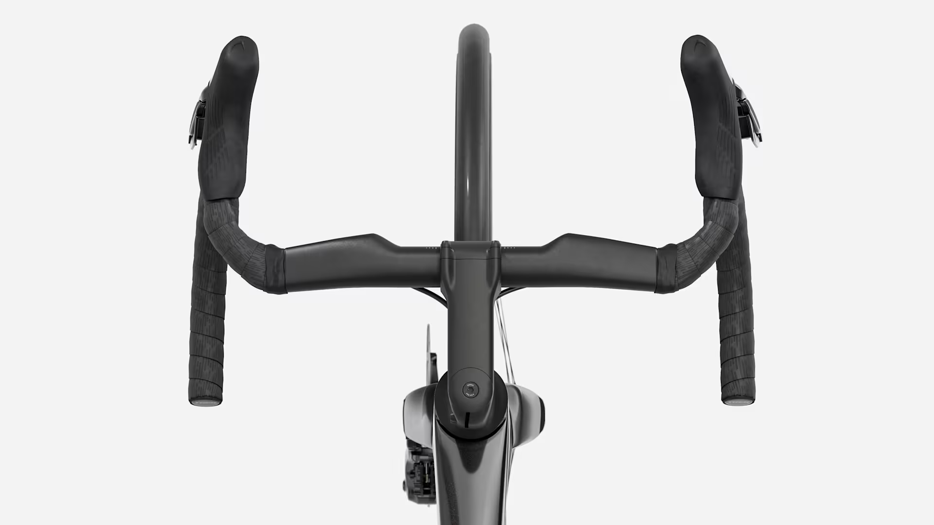 Selim Bontrager Aeolus Elite, carris em austenita, largura de 145 mm. Epigão aerodinâmico Madone em carbono, offset de 0 mm, comprimento curto. Guiador Bontrager Aero Pro, Carbono OCLV, 31.8 mm, passagem interna de cabos Di2, alcance de 80 mm, drop de 124 mm, 42 cm de largura. Fita do guiador Trek EcoTack. Avanço Trek RCS Pro, -7 graus, comprimento de 100 mm.