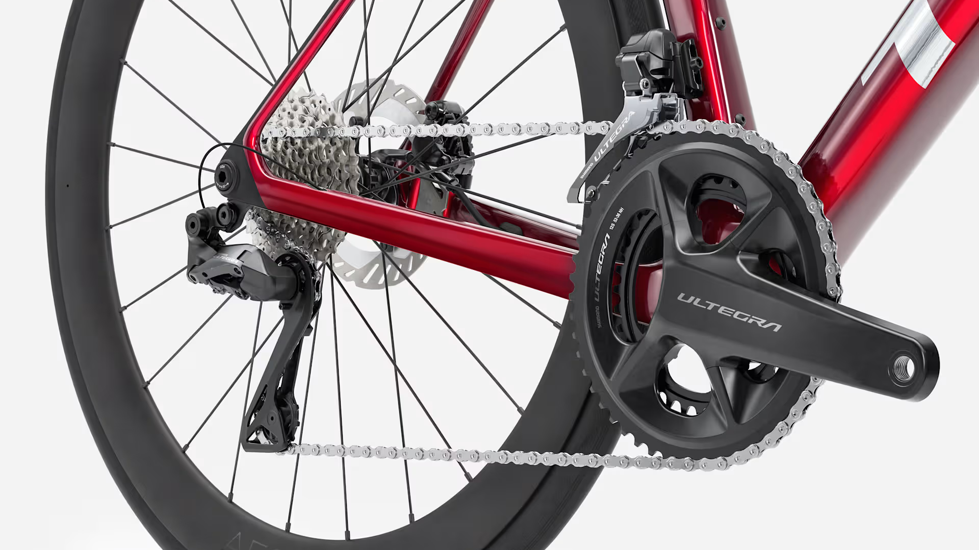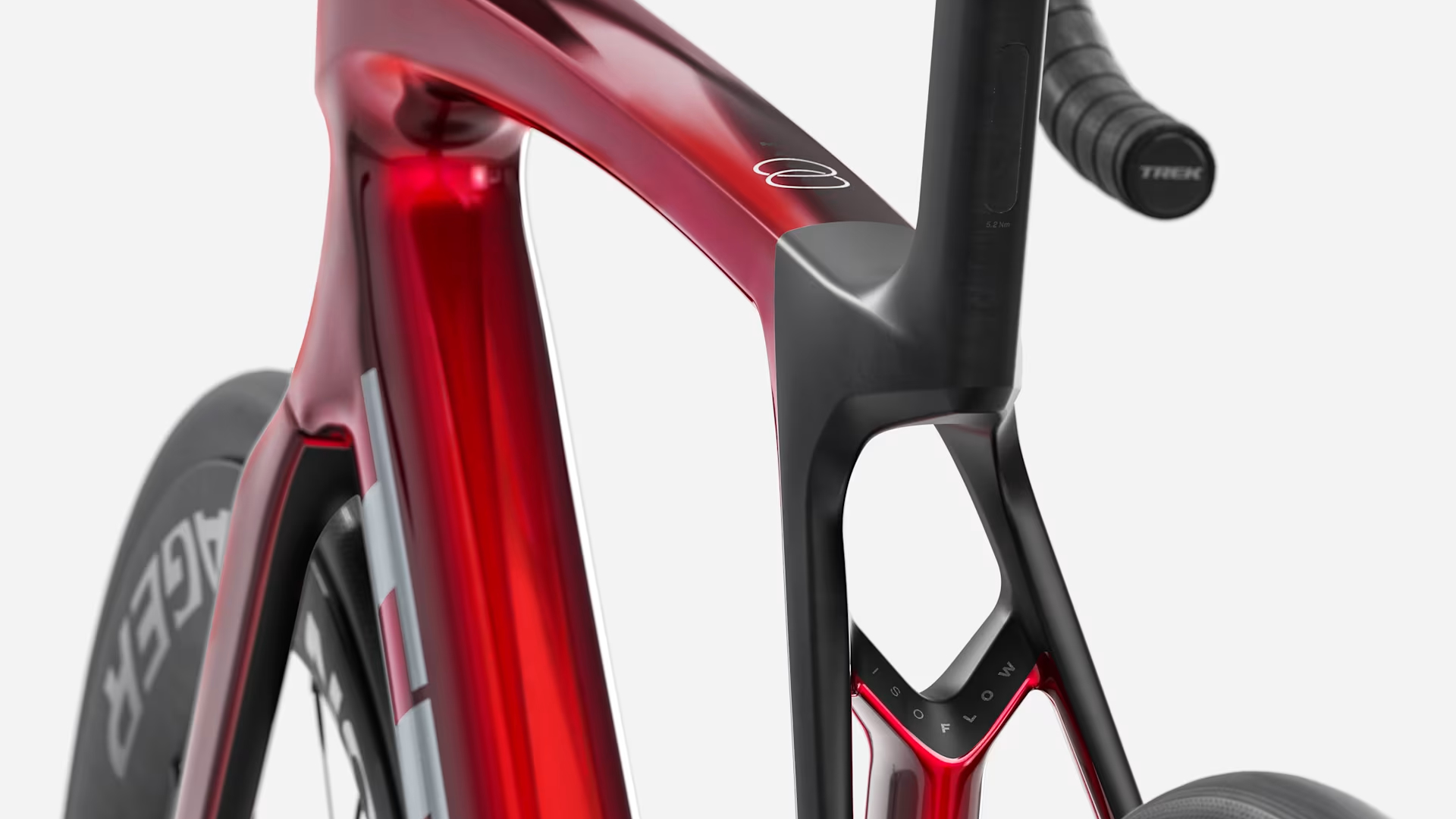 Madone Gen 8 totalmente em carbono, coluna de direção cónica em carbono, cabos internos dos travões, travões de disco flat mount, eixo passante biselado de 12x100 mm.