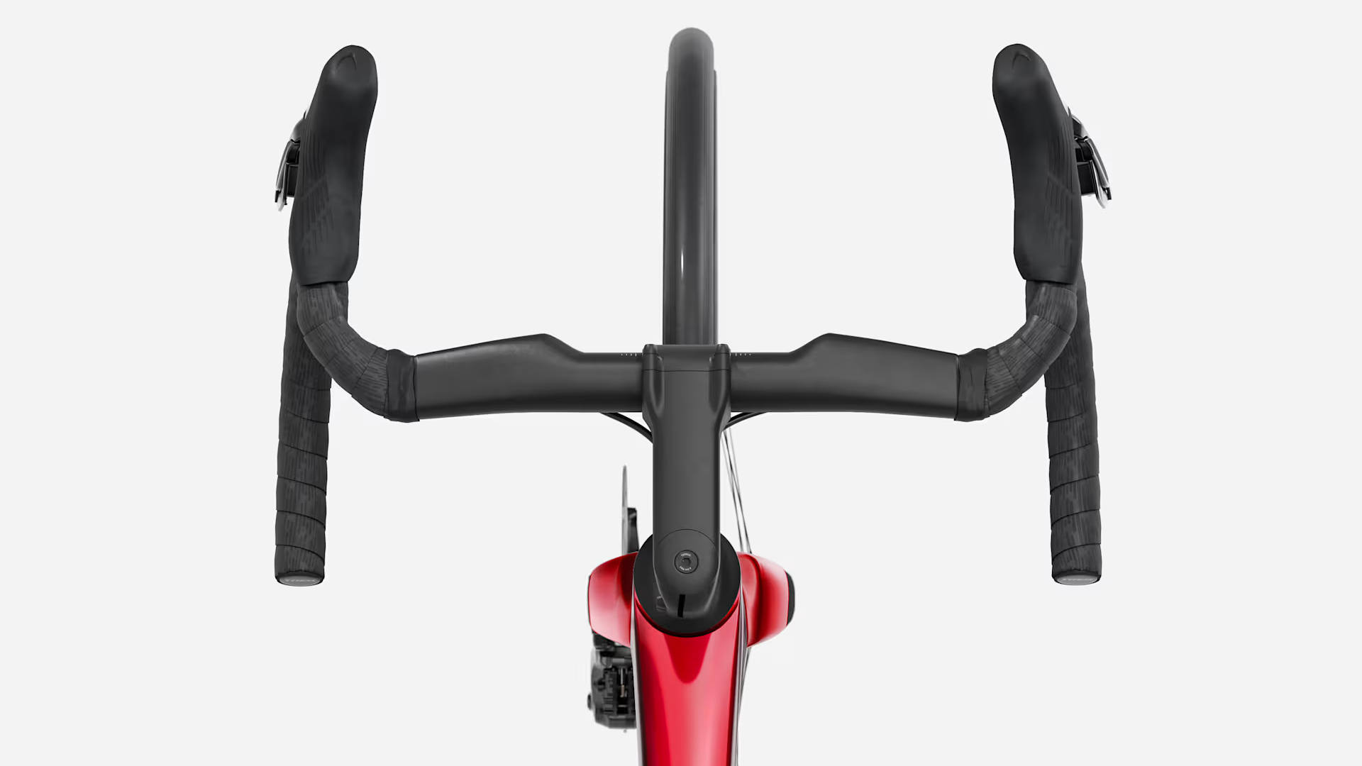 Selim Bontrager Aeolus Elite, carris em austenita, largura de 145 mm. Epigão aerodinâmico Madone em carbono, offset de 0 mm, comprimento curto. Guiador Bontrager Aero Pro, Carbono OCLV, 31.8 mm, passagem interna de cabos Di2, alcance de 80 mm, drop de 124 mm, 40 cm de largura. Fita do guiador Trek EcoTack. Avanço Trek RCS Pro, -7 graus, comprimento de 90 mm.