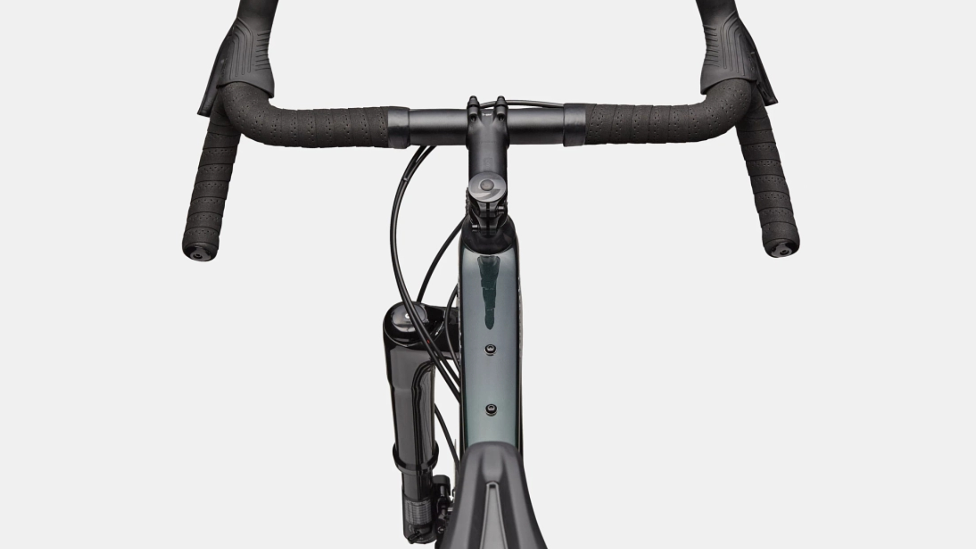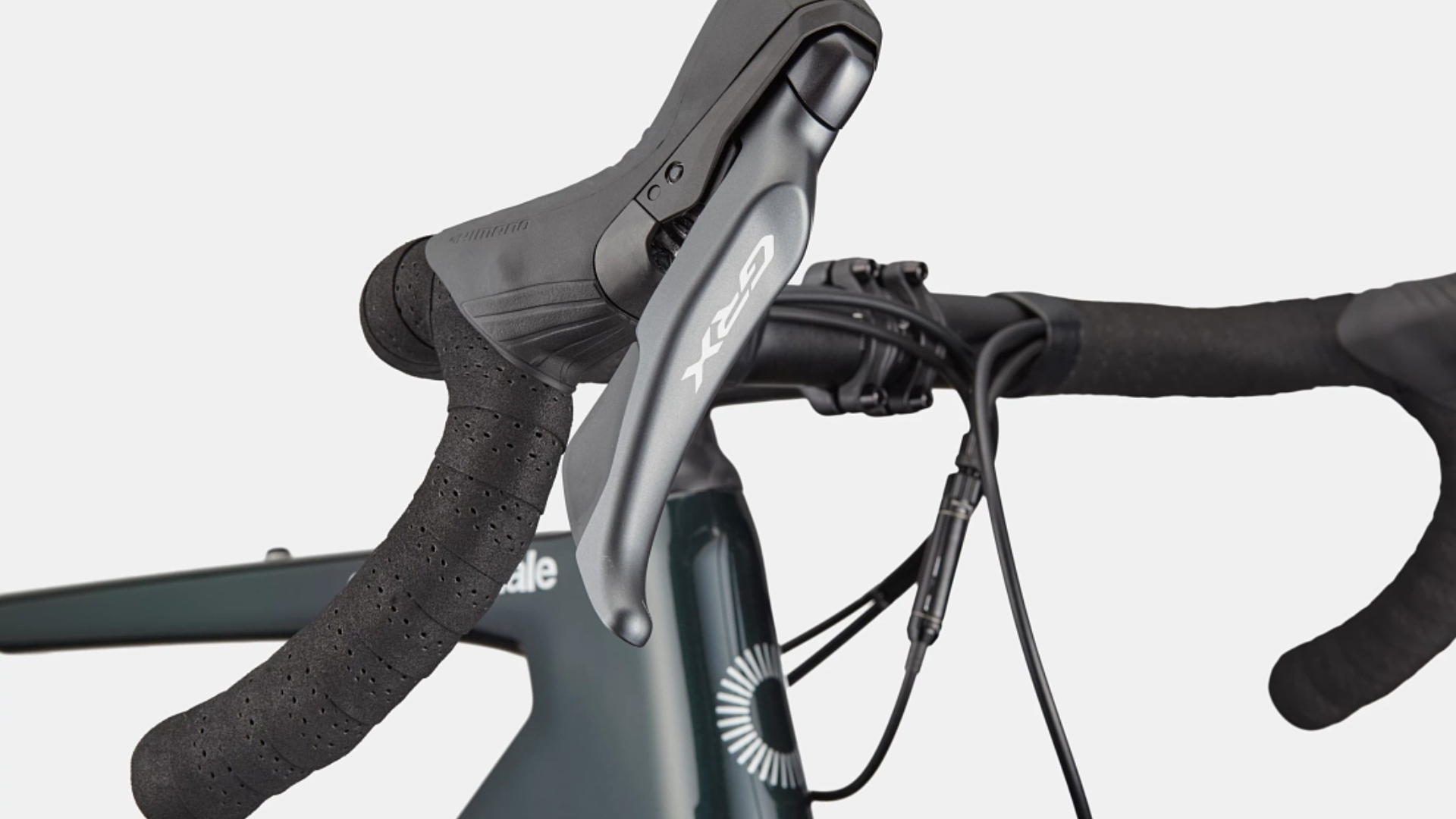 Guiador Cannondale 2 ShortDrop, alumínio 7050, 12 graus de inclinação. Avanço Cannondale 2, alumíno 6061, 31,8, 7°. Fitas de guiador Cannondale, 3,5mm. Selim Fizik Terra Argo X5, carris em s-alloy. Espigã telescópico Cannondale DownLow, 27.2, curso 60/80/100 mm, alavanca integrada na manete de mudanças