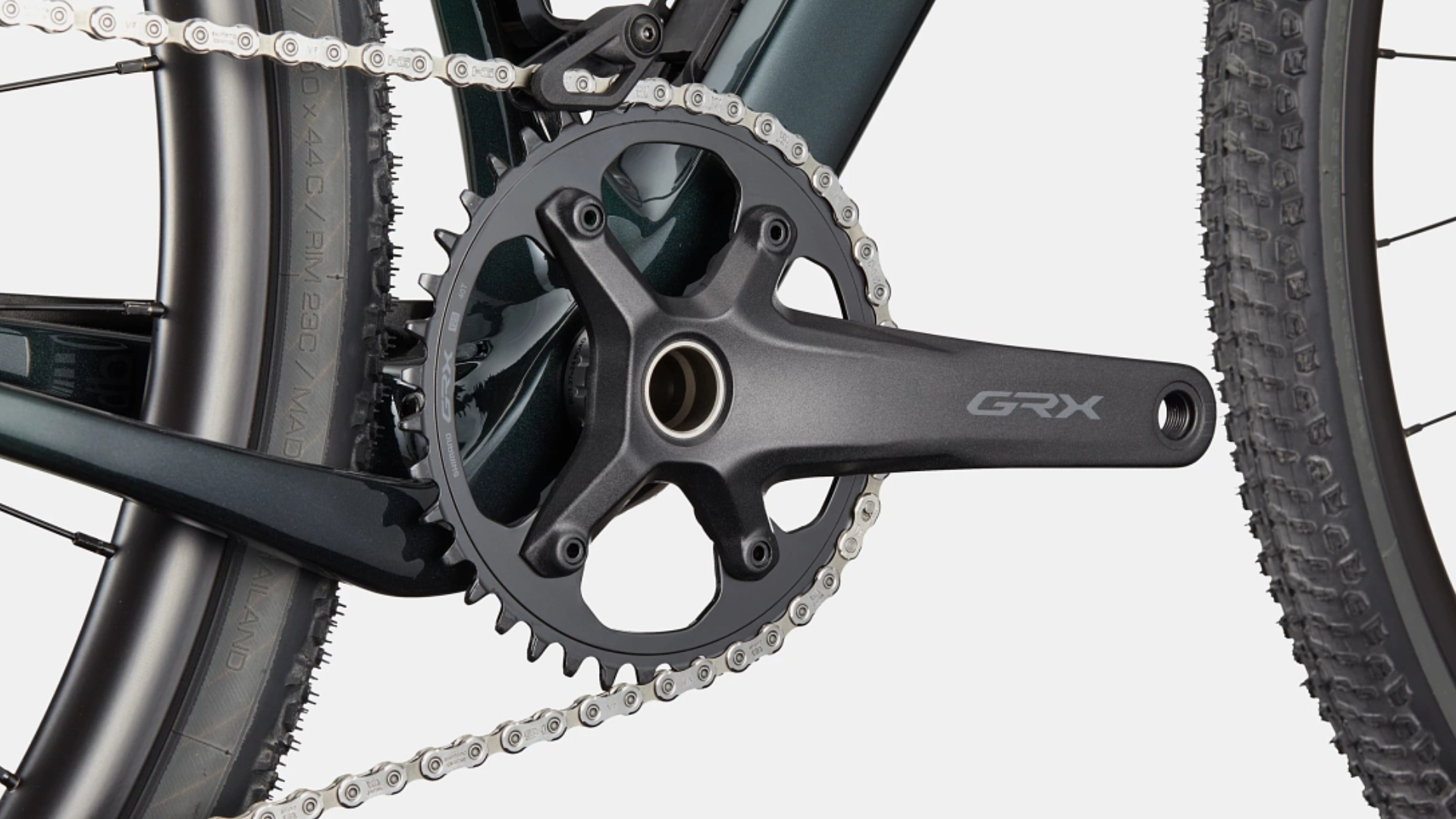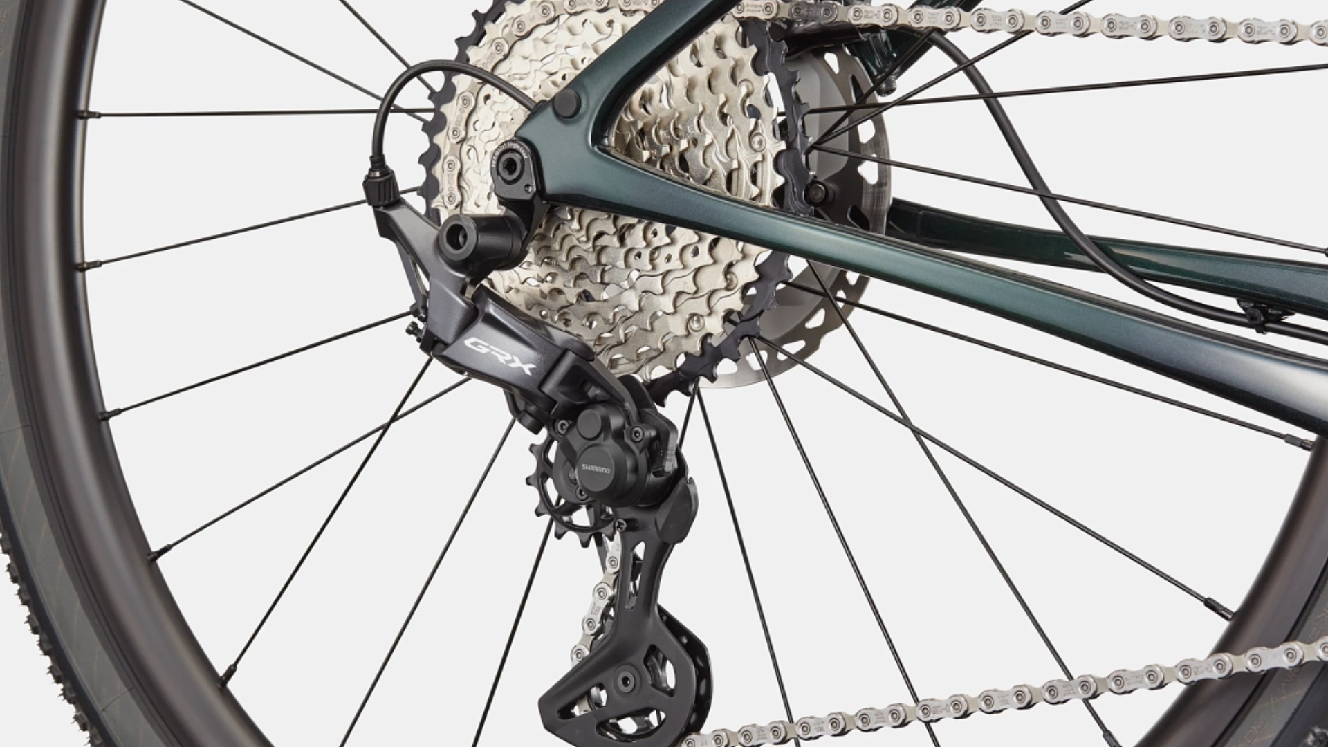 Desviador traseiro Shimano GRX 822, Shadow RD+. Desviador da frente Shimano GRX 800, braze-on. Manípulos Shimano GRX 820, 12 velocidades, com atuador dropper. Corrente Shimano HG M7100, 12 velocidades. Pedaleira Shimano GRX 610, 40D. Cassete Shimano SLX M7100, 10-45, 12 velocidades. Movimento pedaleiro Shimano BSA 68
