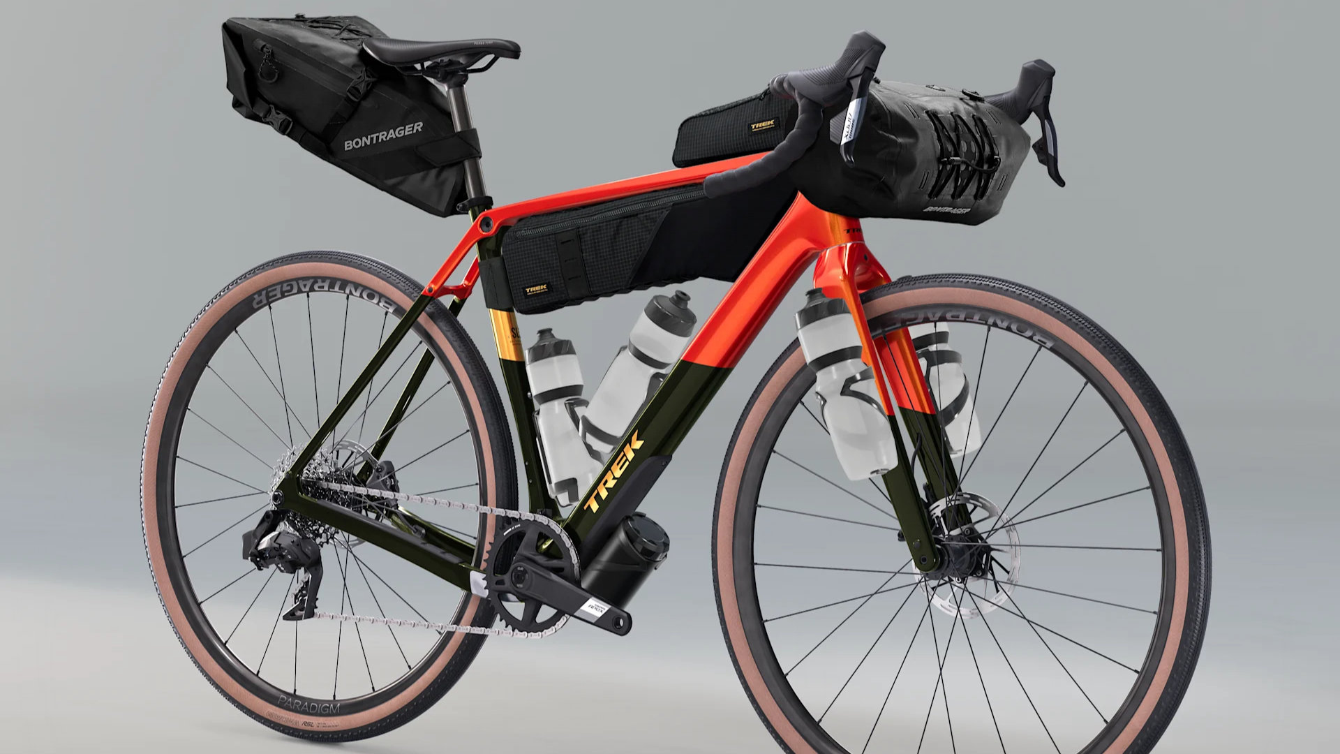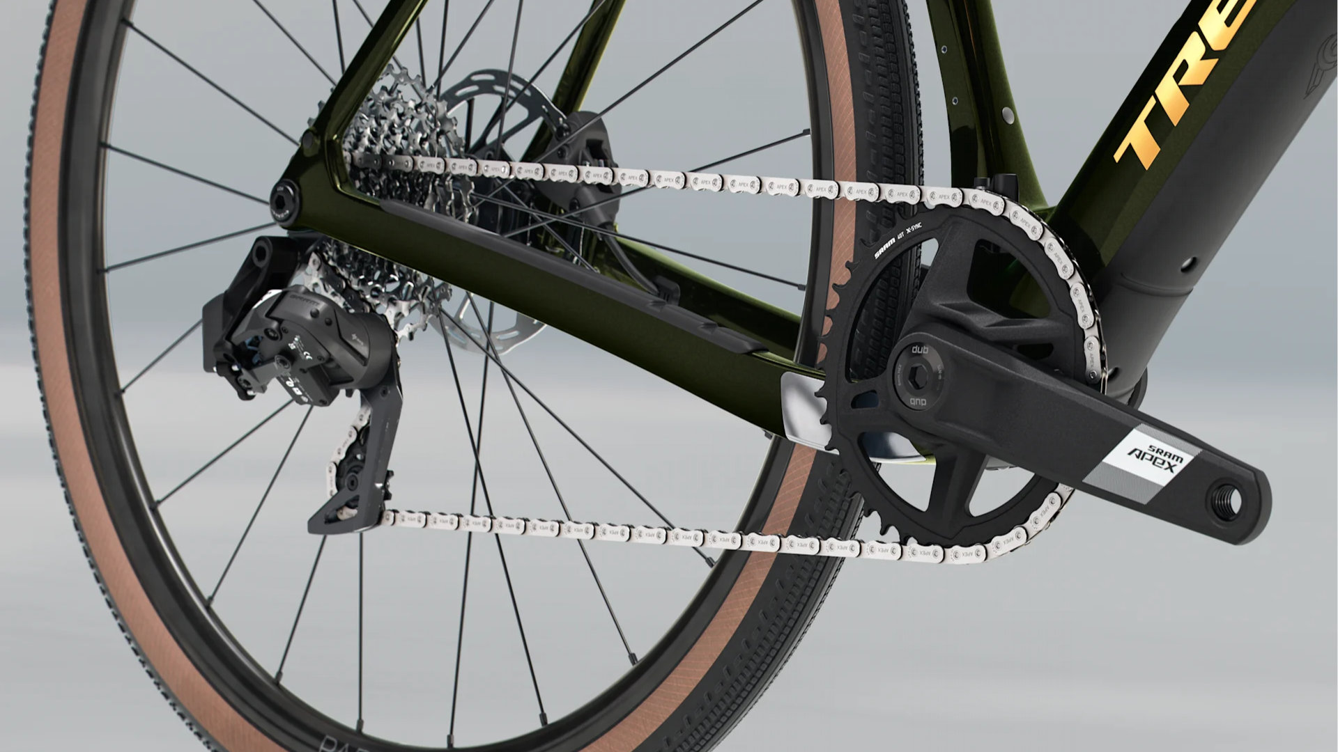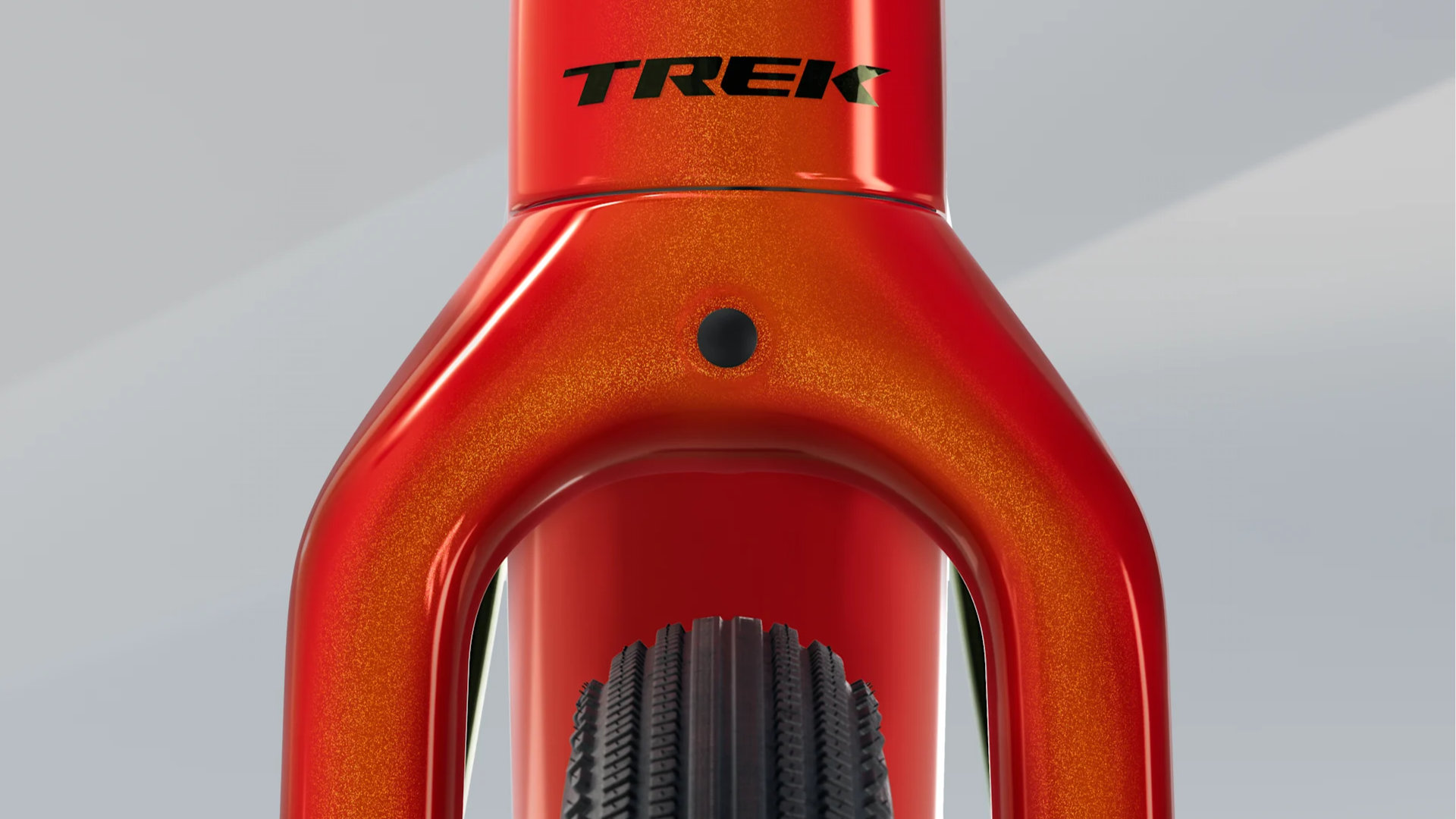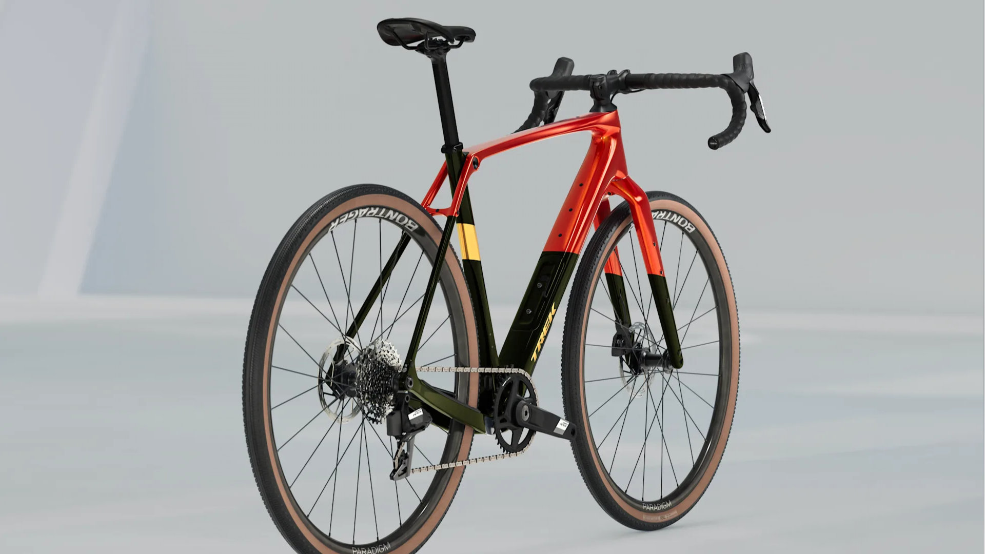 Quadro em carbono OCLV 500 Series com forqueta também em carbono, armazenamento interno no tubo inferior, pontos de fixação no quadro e forqueta e espaço para pneus até 50 mm (conforme medido). Transmissão 1x SRAM Apex XPLR AXS de 12 velocidades totalmente sem fios, travões de disco hidráulicos, espigão em carbono e rodas Bontrager Paradigm SL Tubeless Ready com pneus de 42 mm.