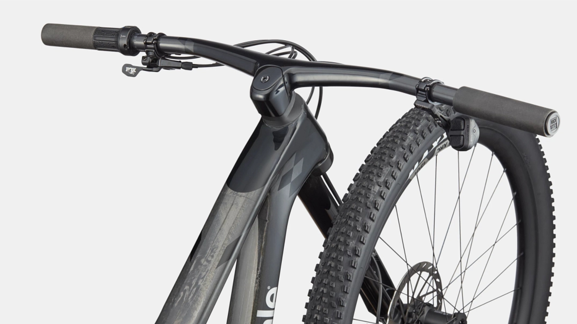 Guiador com avanço integrado SystemBar XC-One Flat, carbono, encaminhamento interno de cabos, 5° de inclinação para cima, 8° de inclinação para trás, 760 mm de largura, avanço de -6°, pinça de 1-1/8. Punhos RockShox Smooth Silicone. Selim Prologo Dimension NDR, calhas em Tirox. Espigão telescópico Fox Transfer SL Performance Elite, 31.6mm, 125mm (S), 150mm (M-XL)