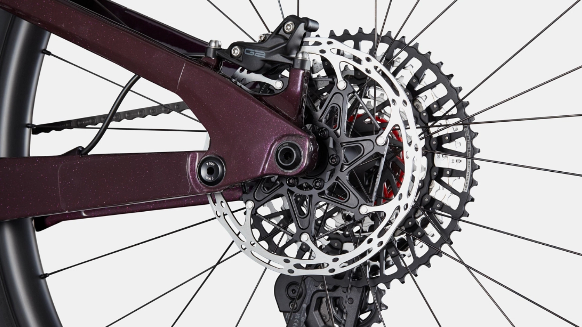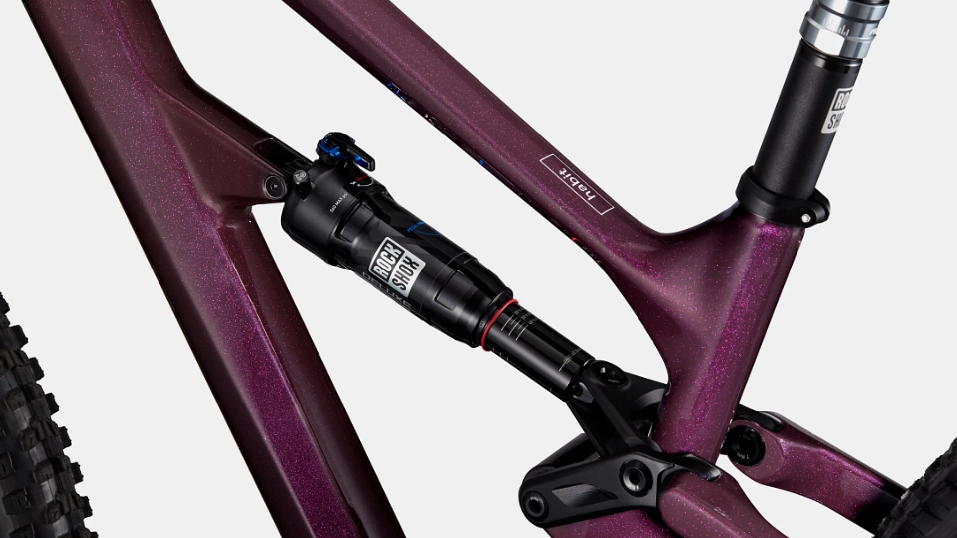 Habit totalmente em carbono, 130 mm de curso, suspensão Proporcional Response e Geo, 55 mm de linha de corrente, ISCG05, BB roscado BSA, travão de montagem no poste, tubo de cabeça cónico, encaminhamento interno de cabos DirectLine, gancho UDH. Caixa de direção cónica, rolamento selado integrado