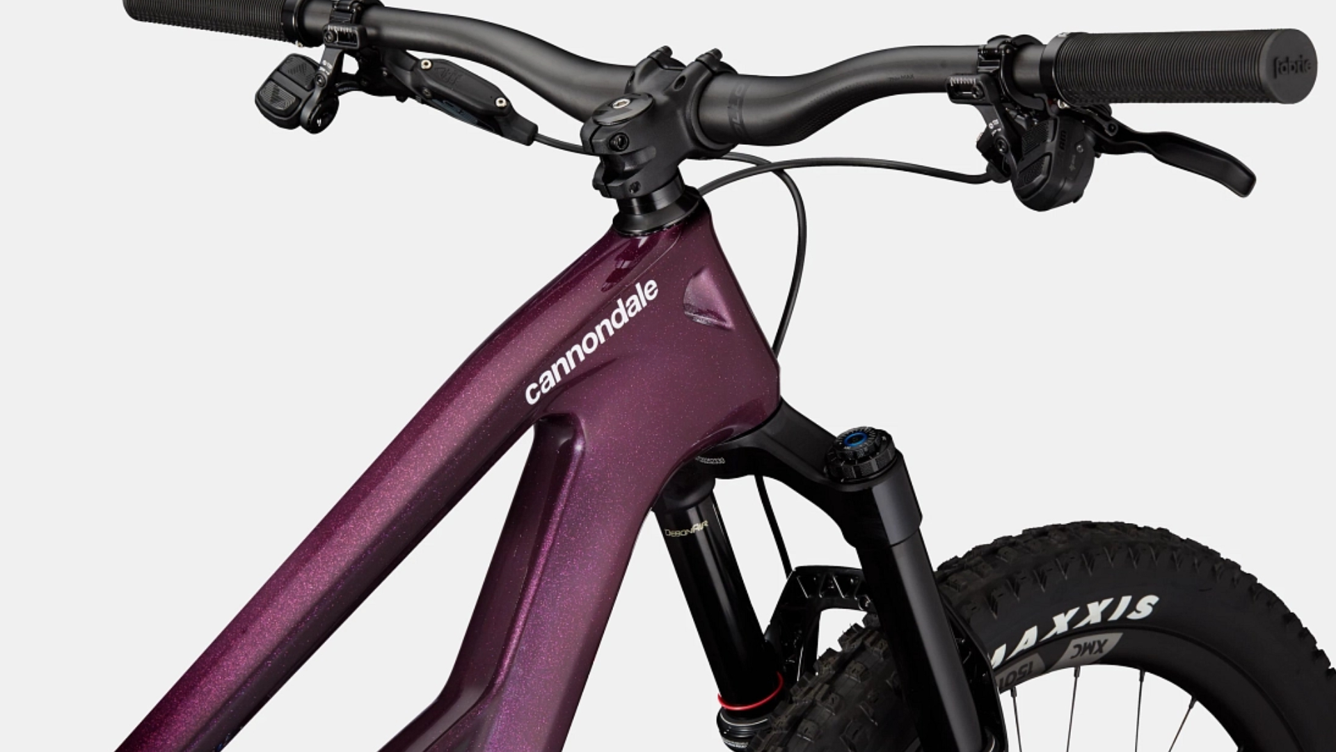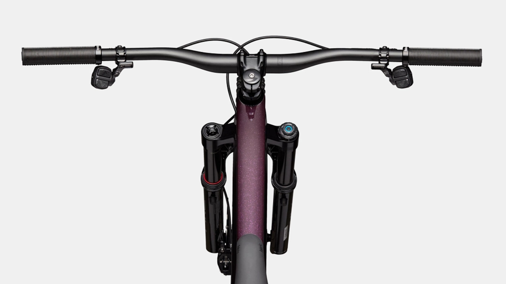 Guiador elevado HollowGram SAVE, carbono, diâmetro 35mm, elevação 30mm, 8° para trás, 5° para cima, comprimento 780mm. Avanço Cannondale 1, alumínio 7075, 1-1/8", 35mm, 0°. Punhos Cannondale TrailShroom. Selim Flat Race, calhas em titânio. Espigão telescópico RockShox Reverb AXS, 31.6, 125mm (XS-S), 150mm (M) 170mm (L-XL)