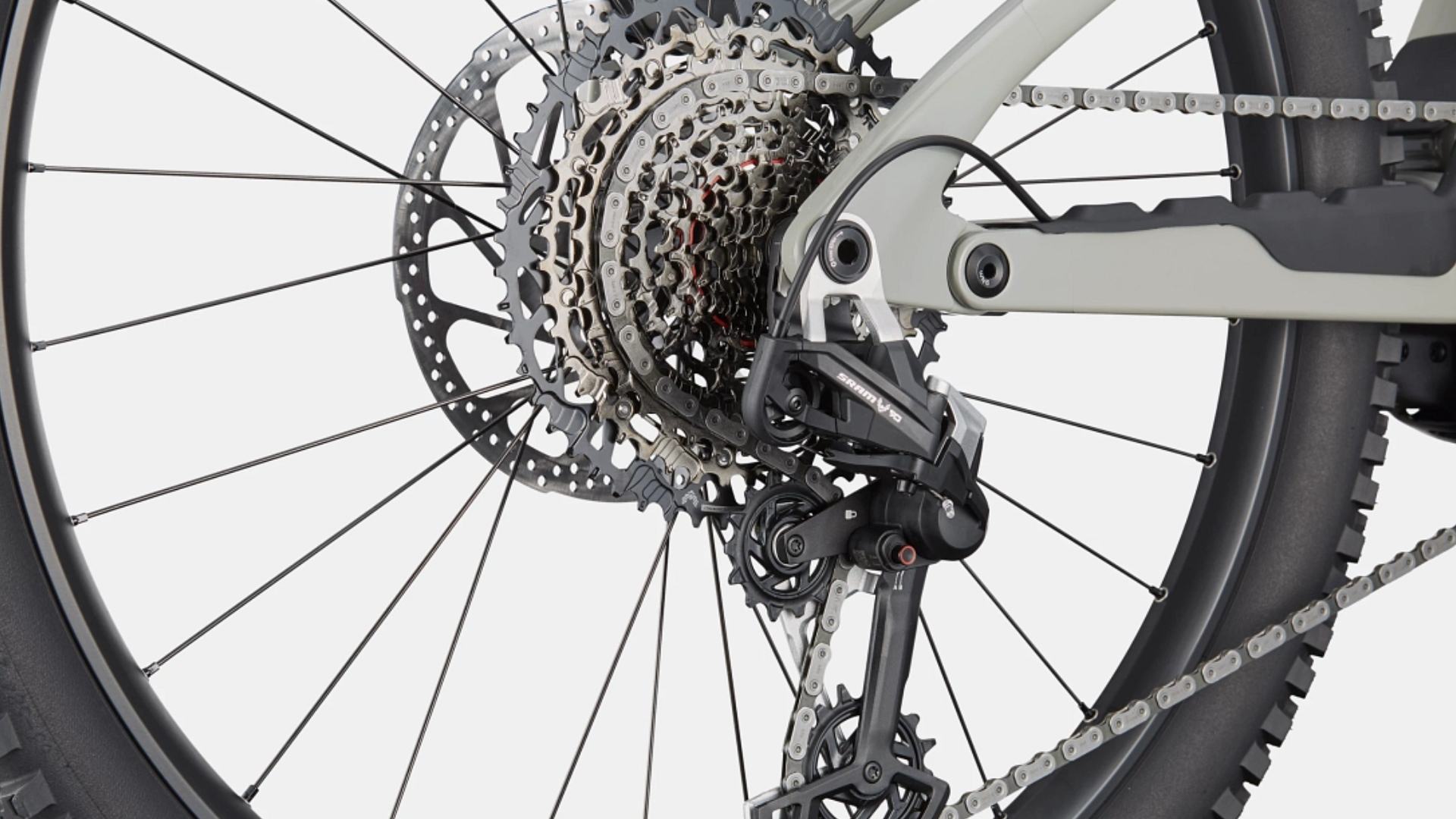 1.000 gramas mais leve do que antes. 170 mm de curso Fox 38. Amortecedor de bobina DHX de 165 mm. A Cannondale Moterra LT não está aqui para andar na ponta dos pés. Está aqui para rasgar. Esta bicicleta foi feita para aguentar uma pancada e voltar para mais.