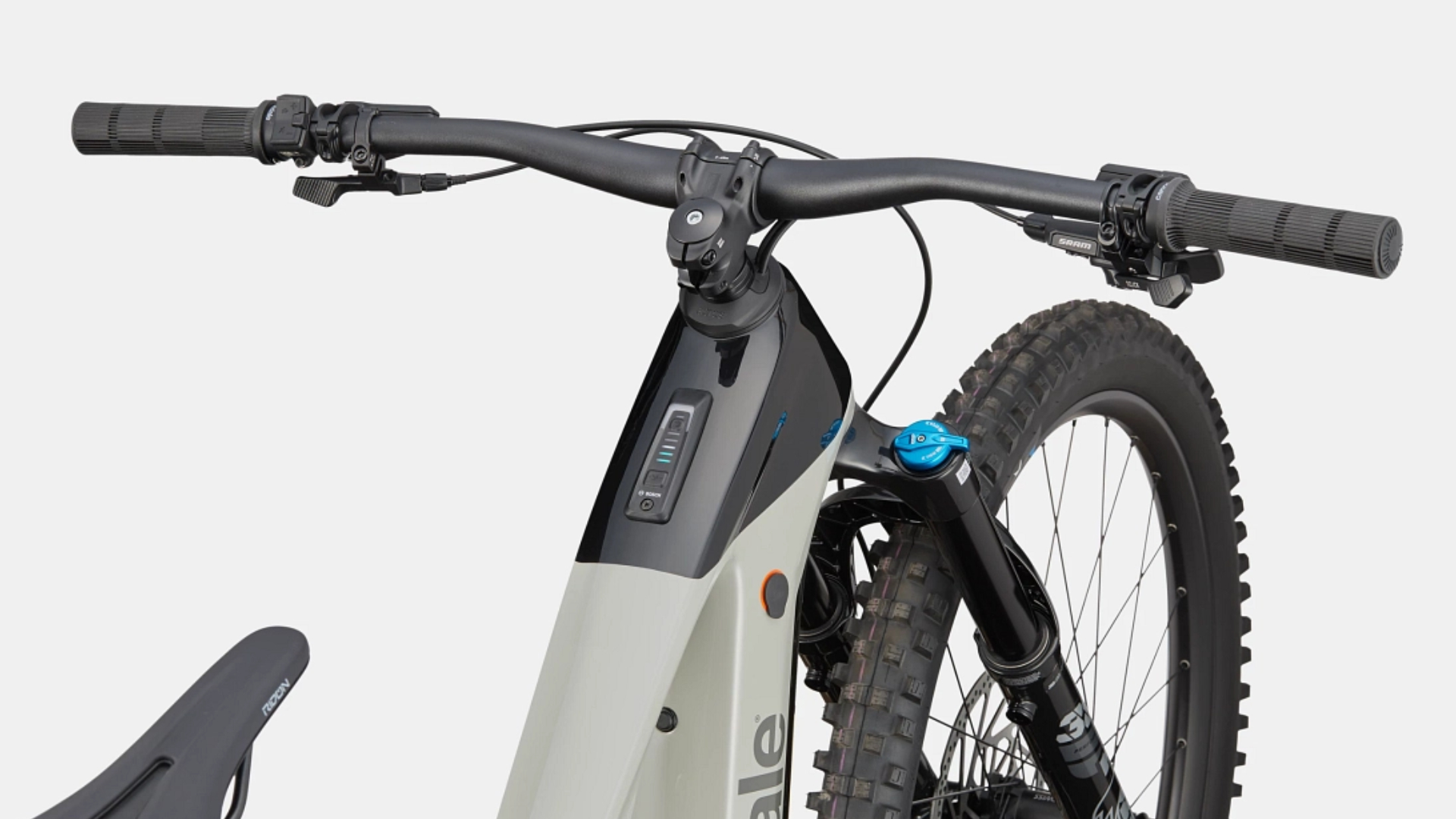 Guiador Cannondale 3 riser, alumínio 6061, elevação 25mm, 8° para trás, elevação 4°, comprimento 800mm. Avanço Cannondale 1, alumínio 6061, diâmetro 35mm, comprimento 40mm, 0°. Punhos Cannondale TaperRidge. Selim Fizik Terra Aidon X5, 145mm, Wingflex, S-Alloy Mobius rail. Espigão telescópico Cannondale DownLow Dropper, internal routing, 34.9, 150mm (S), 170mm (M), 200mm (L), 230mm (XL)
