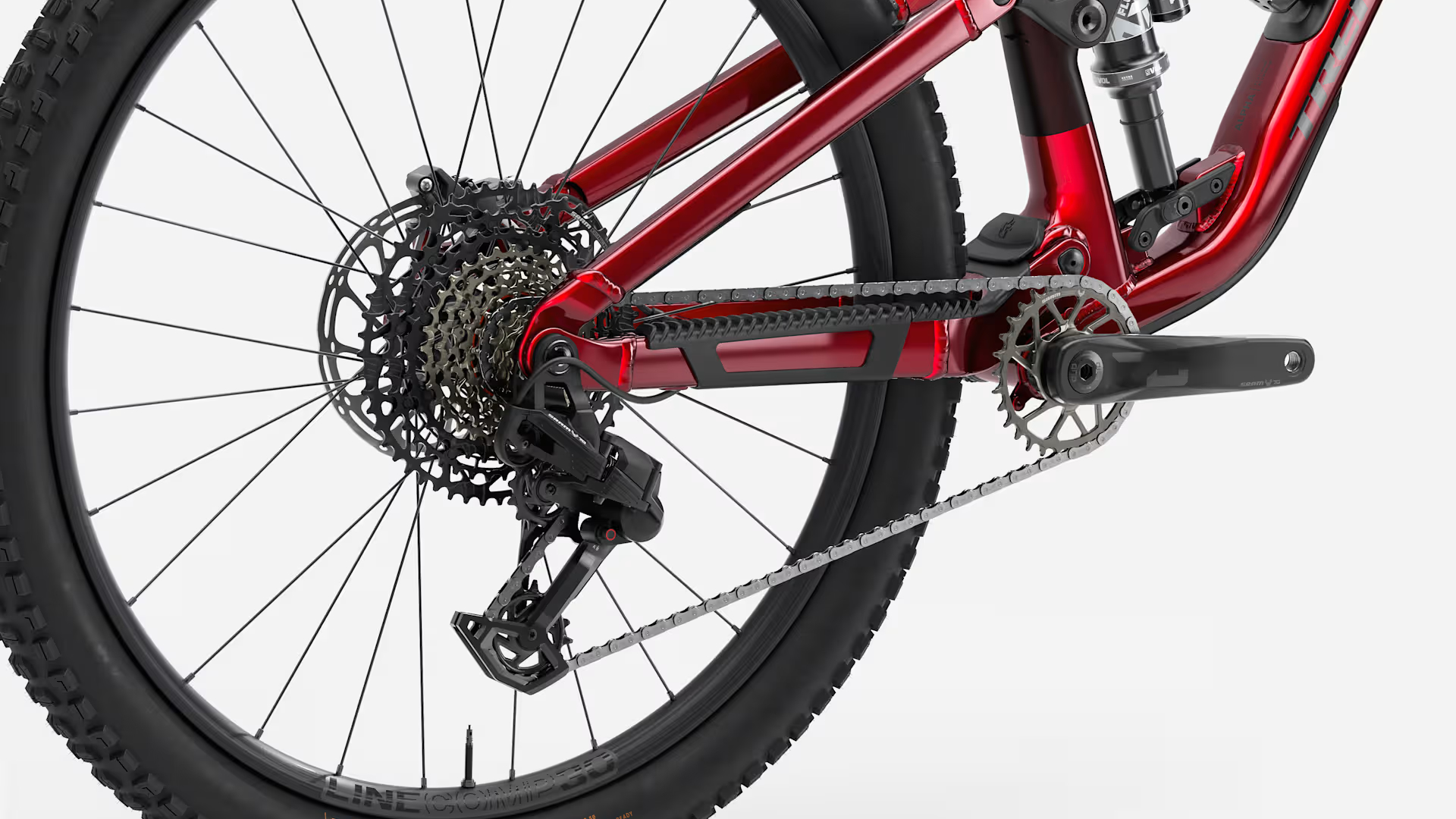 Bontrager Line TLR 30, Tubeless Ready, 28 furos, válvula Presta. Cubos Bontrager alumínio, rolamento selado, eixo passante Bontrager Switch, manete removível em alumínio, 6 parafusos (F) Boost 110x15 mm / (T) Rapid Drive 108, cepo Shimano, Boost 148x12 mm. Raios 14g aço inoxidável, pretos. Pneus Bontrager Brevard Pro XR, Tubeless Ready, composto duplo, talão em aramida, 60 tpi, 29x2.50”. Fita de aro Bontrager TLR.