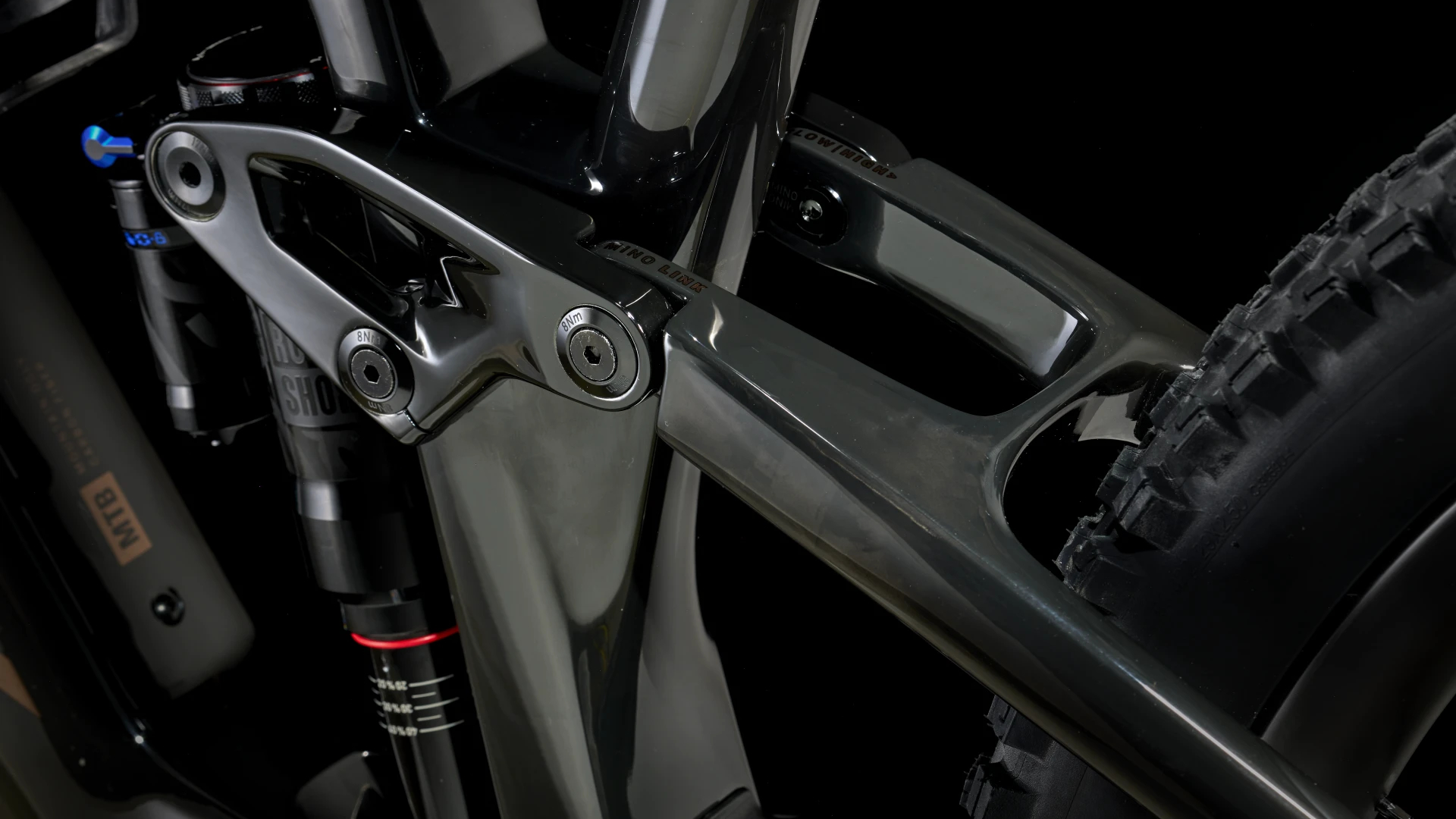 Carbono OCLV Mountain, bateria amovível, encaminhamento de cabos, braço oscilante em alumínio, tubo do selim de 34,9 mm, apoio de fixação para guia de corrente superior, linha de corrente de 55 mm, Mino Link, ABP, Boost148, UDH, curso de 140 mm