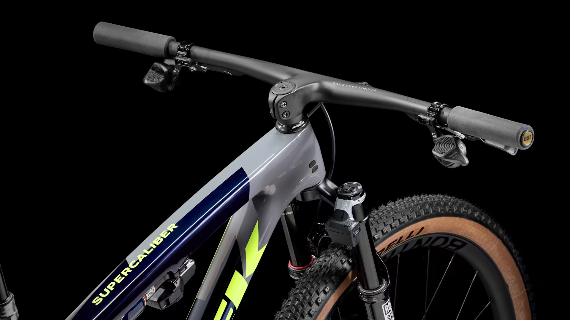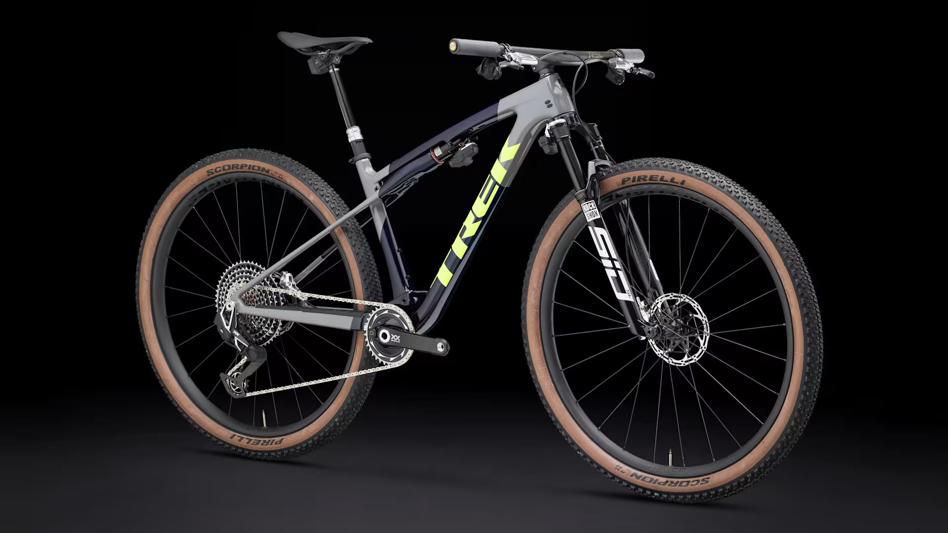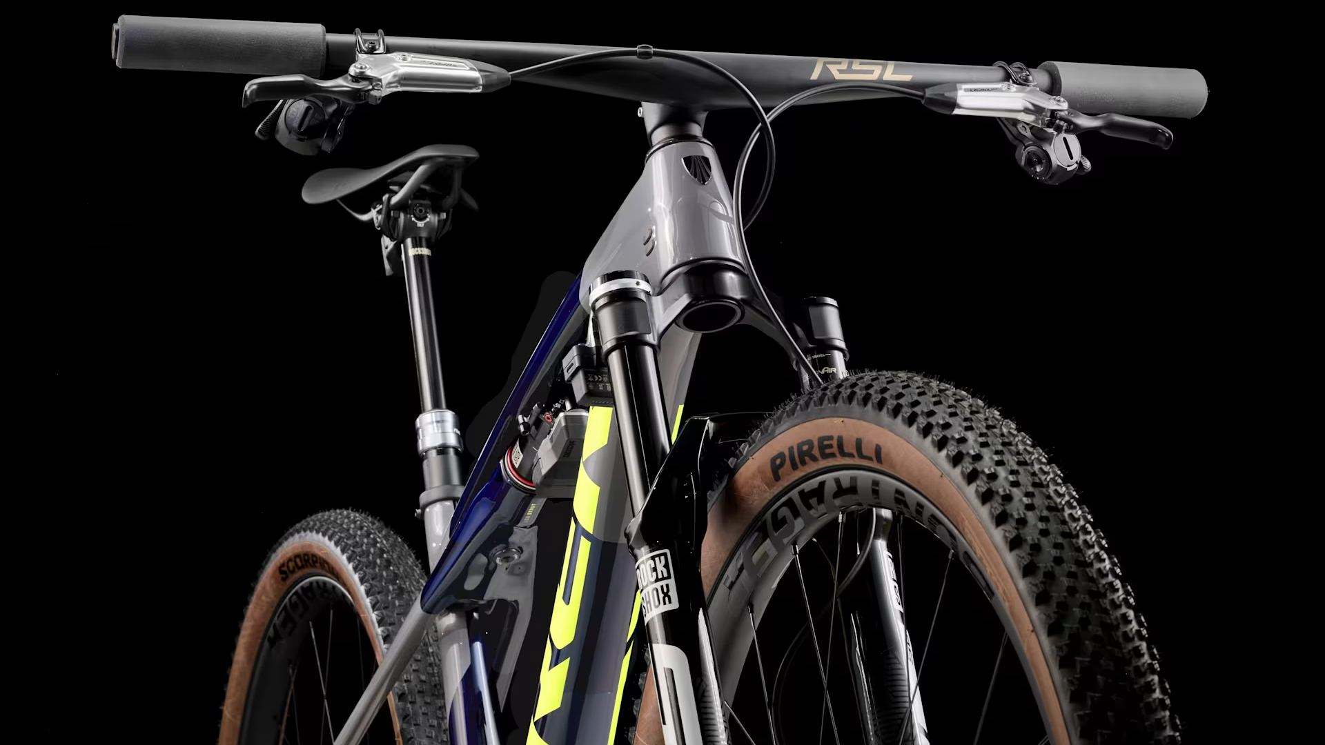 Um quadro SLR muito leve, em Carbono OCLV Mountain de alto módulo, com geometria XC moderna, 110 mm de curso com a suspensão dianteira RockShox SID SL Ultimate com mola DebonAir e amortecedor Charger Race Day, 80 mm de curso traseiro com o amortecedor IsoStrut RockShox SIDLuxe. Tudo com tecnologia Flight Attendant. Uma transmissão totalmente eletrónica, ultraleve, sem fios, SRAM XX SL AXS de 12 velocidades, rodas em carbono Bontrager Kovee RSL, conjunto integrado de avanço/guiador Bontrager RSL, espigão telescópico sem fios RockShox Reverb AXS e travões de disco hidráulicos de 4 pistões SRAM Level Ultimate.