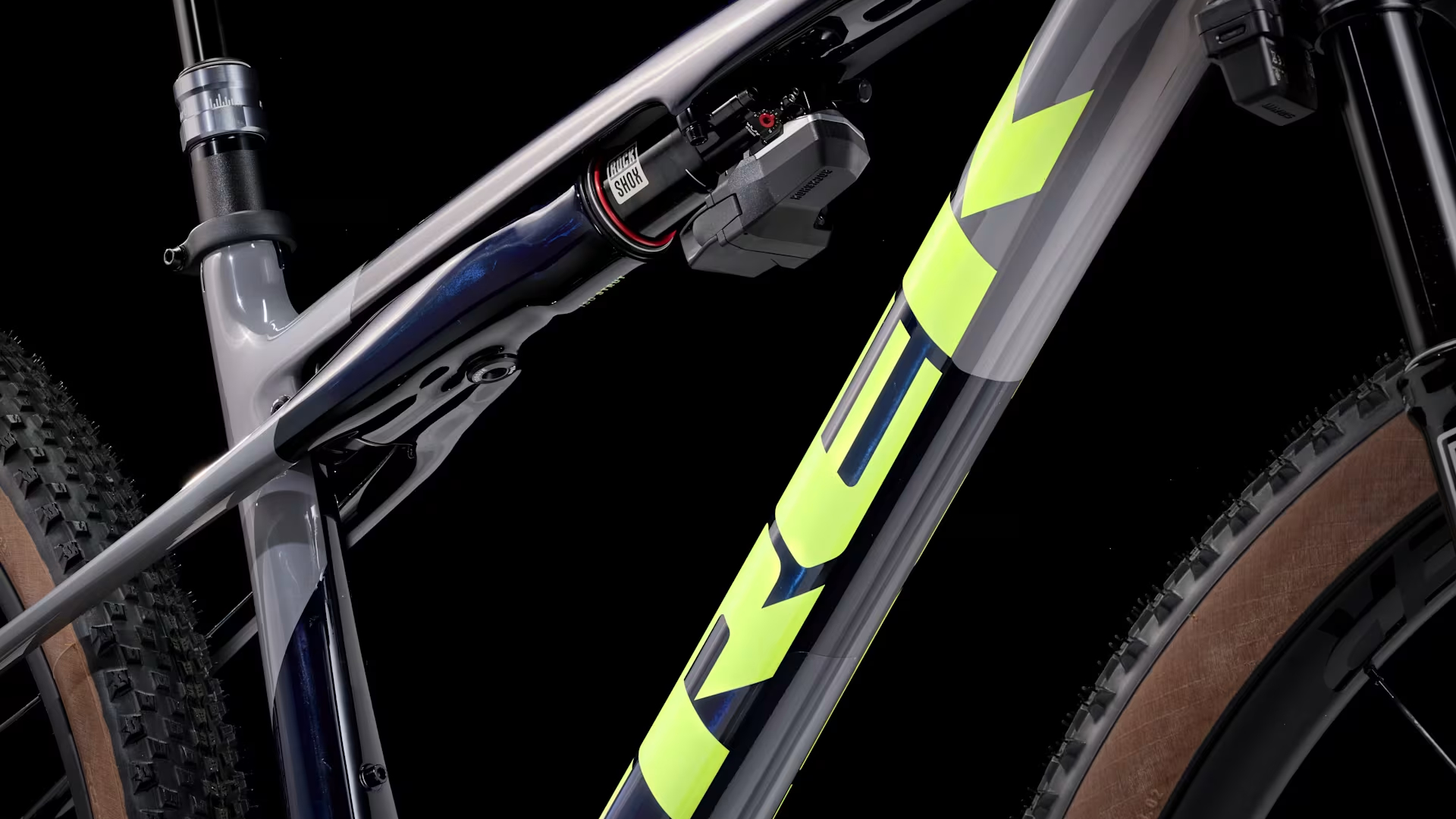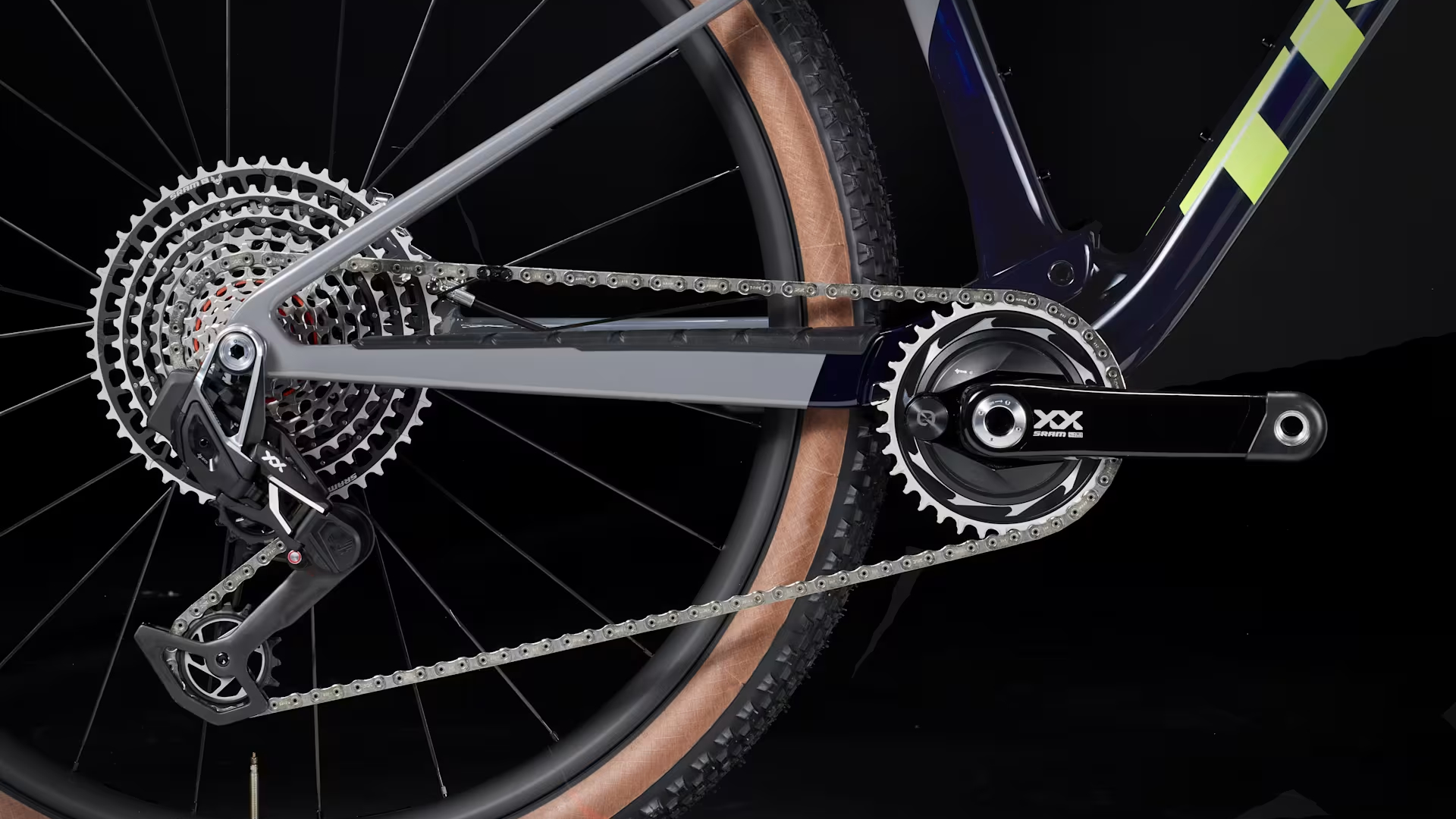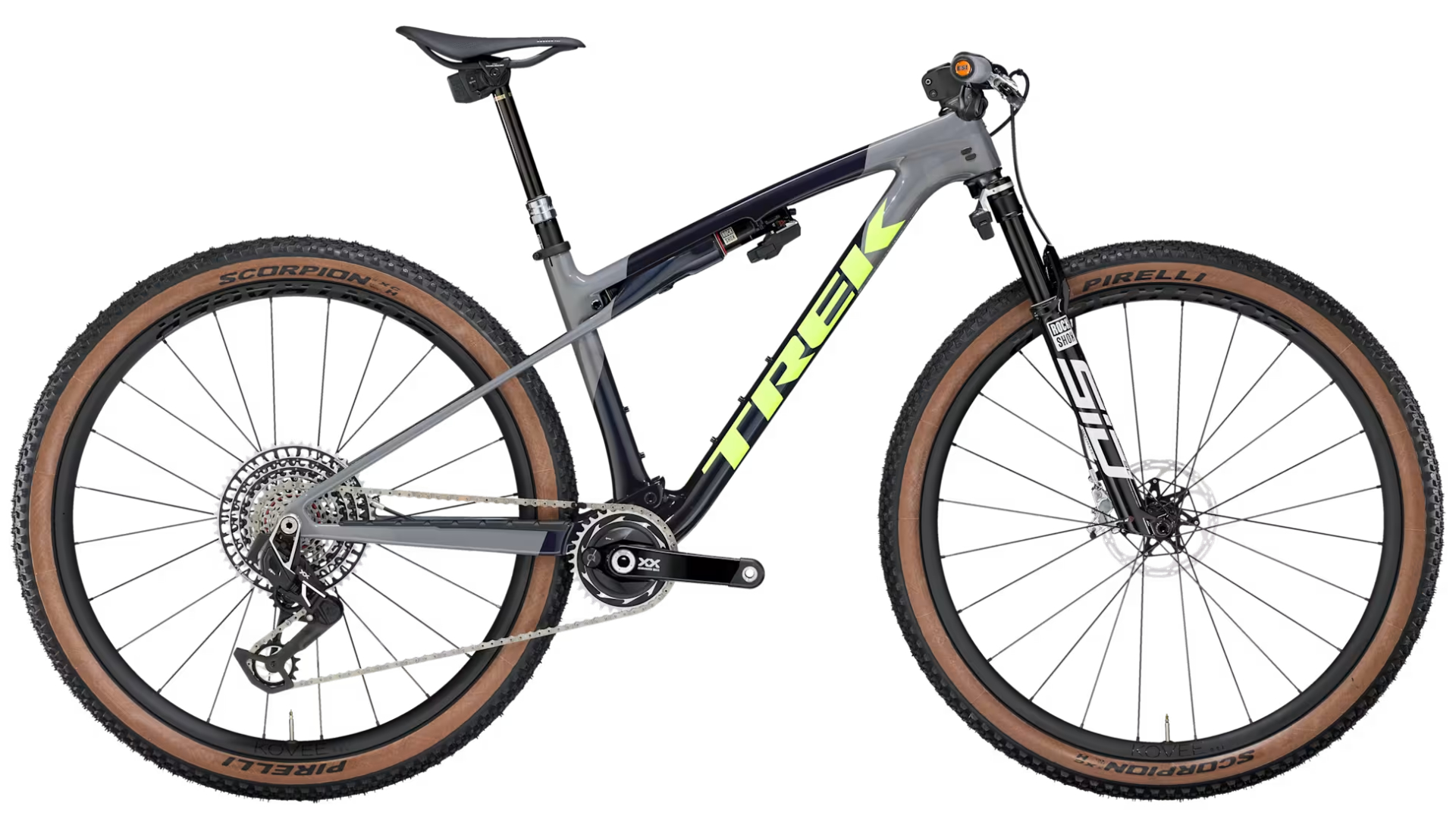 Um quadro SLR muito leve, em Carbono OCLV Mountain de alto módulo, com geometria XC moderna, 110 mm de curso com a suspensão dianteira RockShox SID SL Ultimate com mola DebonAir e amortecedor Charger Race Day, 80 mm de curso traseiro com o amortecedor IsoStrut RockShox SIDLuxe. Tudo com tecnologia Flight Attendant. Uma transmissão totalmente eletrónica, ultraleve, sem fios, SRAM XX SL AXS de 12 velocidades, rodas em carbono Bontrager Kovee RSL, conjunto integrado de avanço/guiador Bontrager RSL, espigão telescópico sem fios RockShox Reverb AXS e travões de disco hidráulicos de 4 pistões SRAM Level Ultimate.