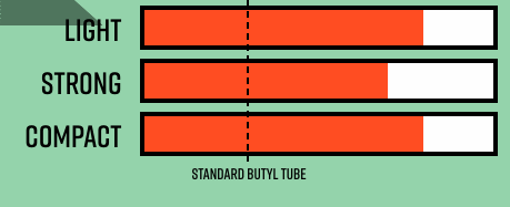 Preparado para travões de disco e travões de aro, o Tubo-Road adapta-se facilmente a pneus de 18 a 28 mm de largura. Em comparação com os tubos butílicos padrão para bicicletas de estrada, você economizará quase 70 g de peso rotativo por roda. A proteção contra furos é igualmente excelente: Tubo-Road é 2 vezes mais resistente a furos do que um tubo de bicicleta butil padrão.