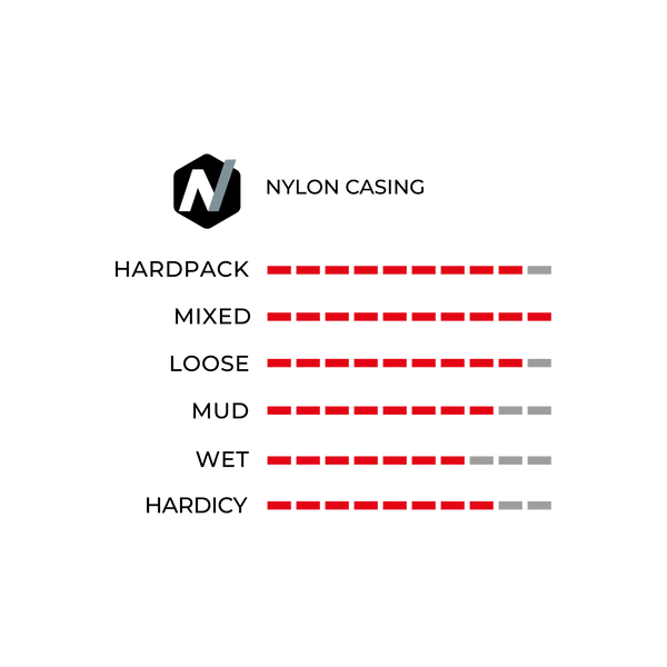 Os manípulos centrais alternados rolam rapidamente e os manípulos dos ombros de estilo moto mordem com força nas curvas. O siping aumenta a aderência sob cargas laterais, ajudando a manter a velocidade em terrenos de todos os tipos, e a colocação espaçosa dos manípulos limpa a lama e o solo argiloso.