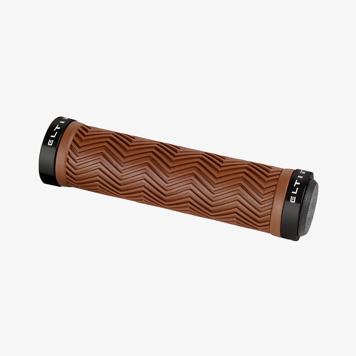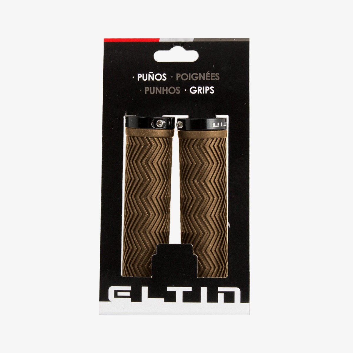 Punhos para bicicleta com fecho duplo de bloqueio fabricado de borracha tipo gel em cor castanha. Design com nervuras que facilita a aderência ao guiador aumentando o conforto.