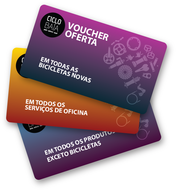 Propomos vouchers oferta para Bicicletas Novas, Peças e Acessórios ou Serviços de Oficina. Para cada voucher, diferentes valores à tua escolha. Seleciona o voucher certo, paga como te convém e envia-o ao ciclista que vais surpreender.